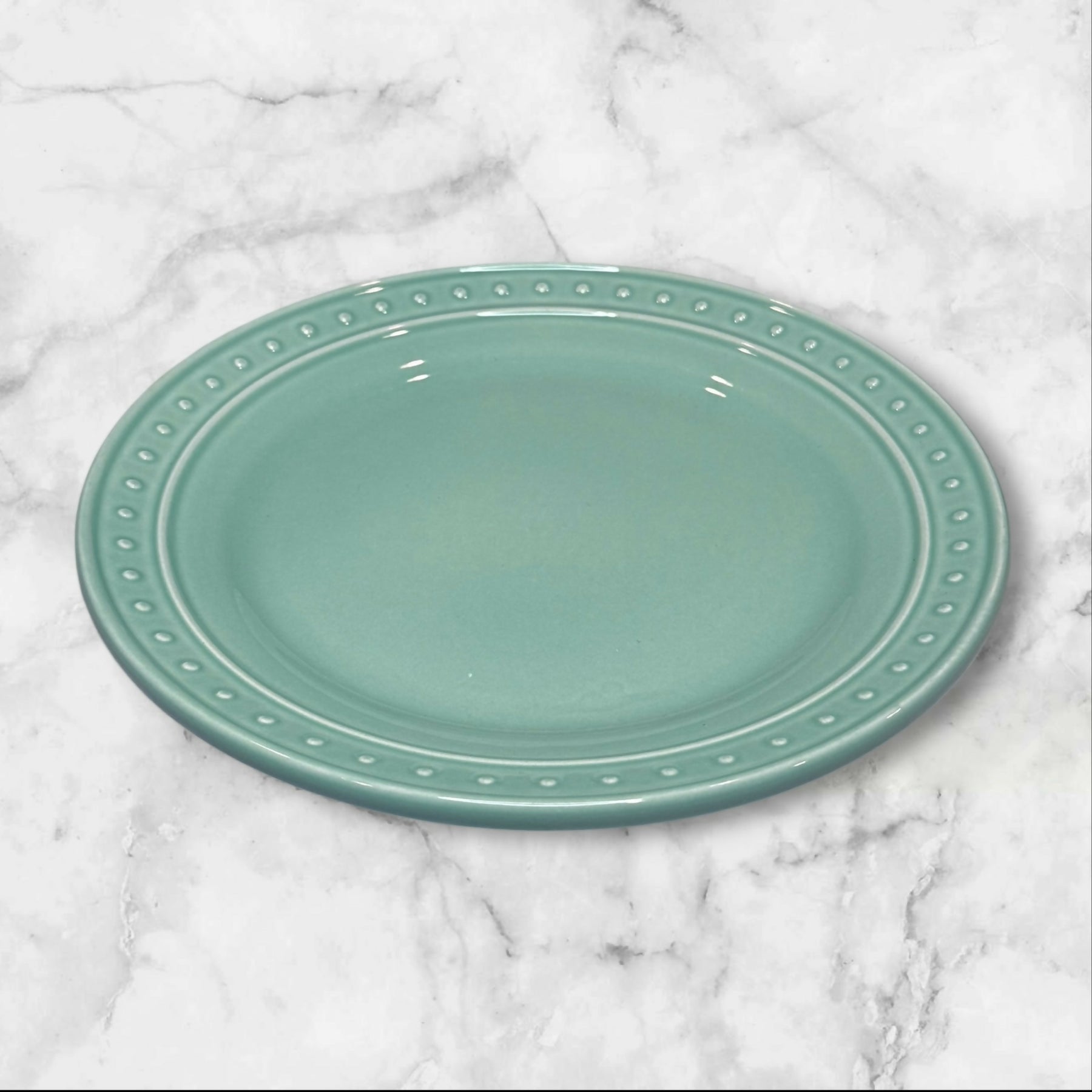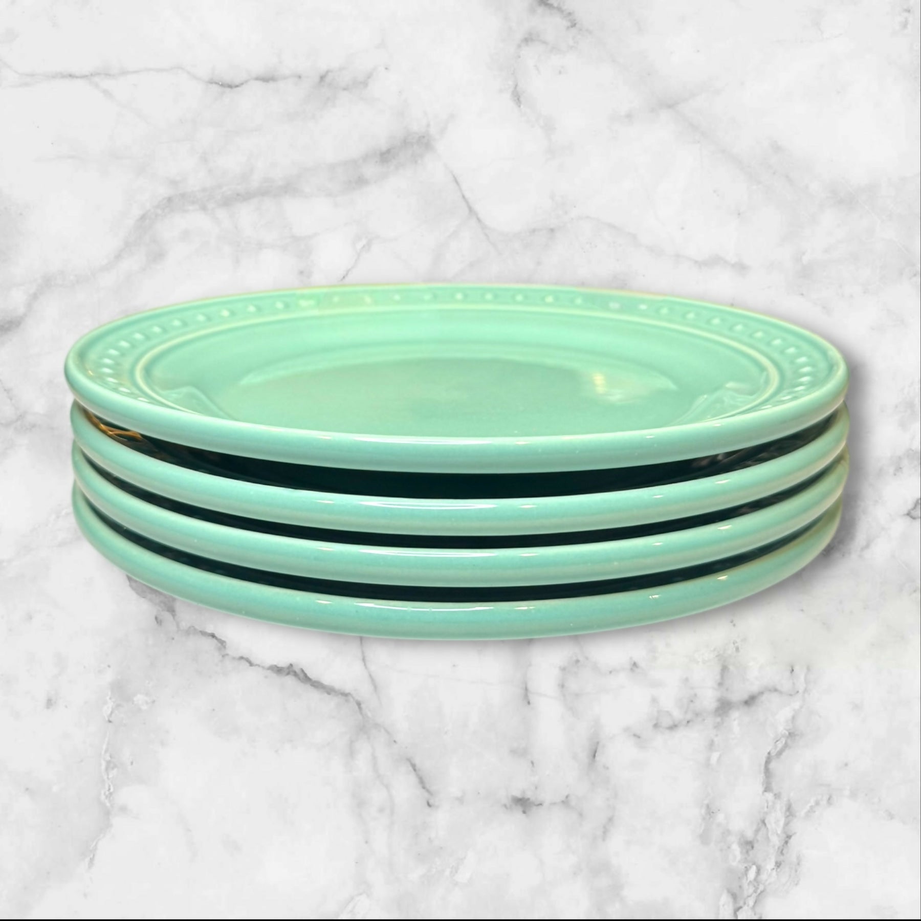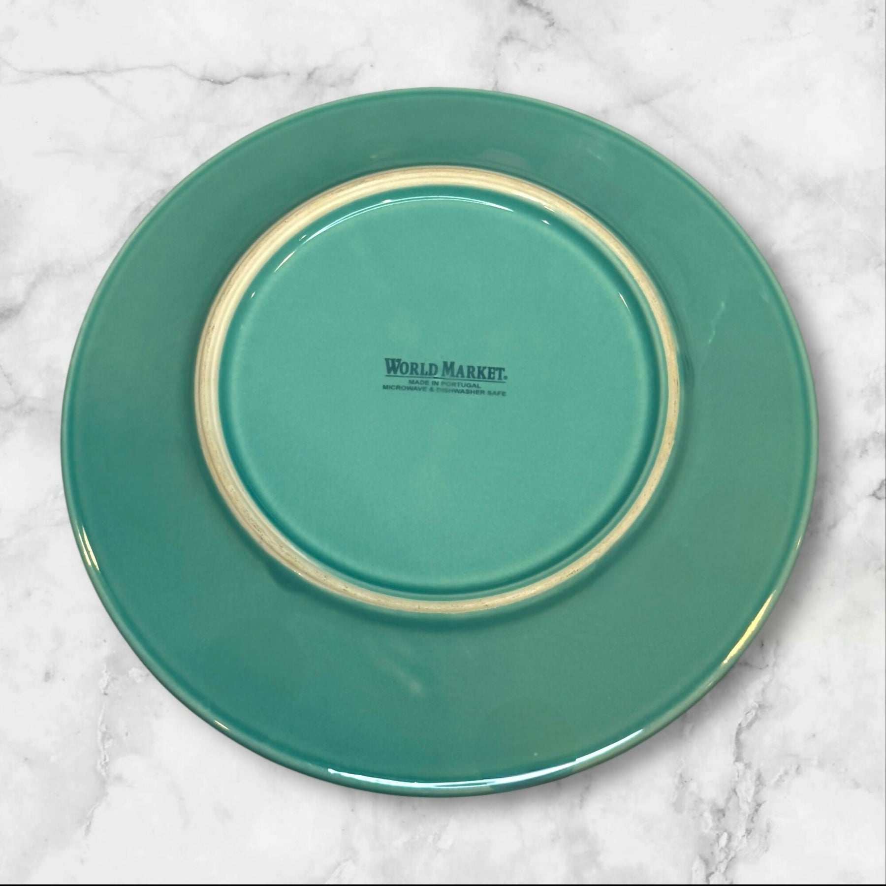 Add a touch of coastal charm to your table with this set of four Nantucket Aqua salad plates from World Market. Crafted in Portugal, these plates feature a serene sea-glass blue glaze with a dotted rim for subtle texture and style. Ideal for salads, desserts, or casual dining, they’re microwave and dishwasher safe. All plates are in excellent pre-owned condition with minimal signs of use.