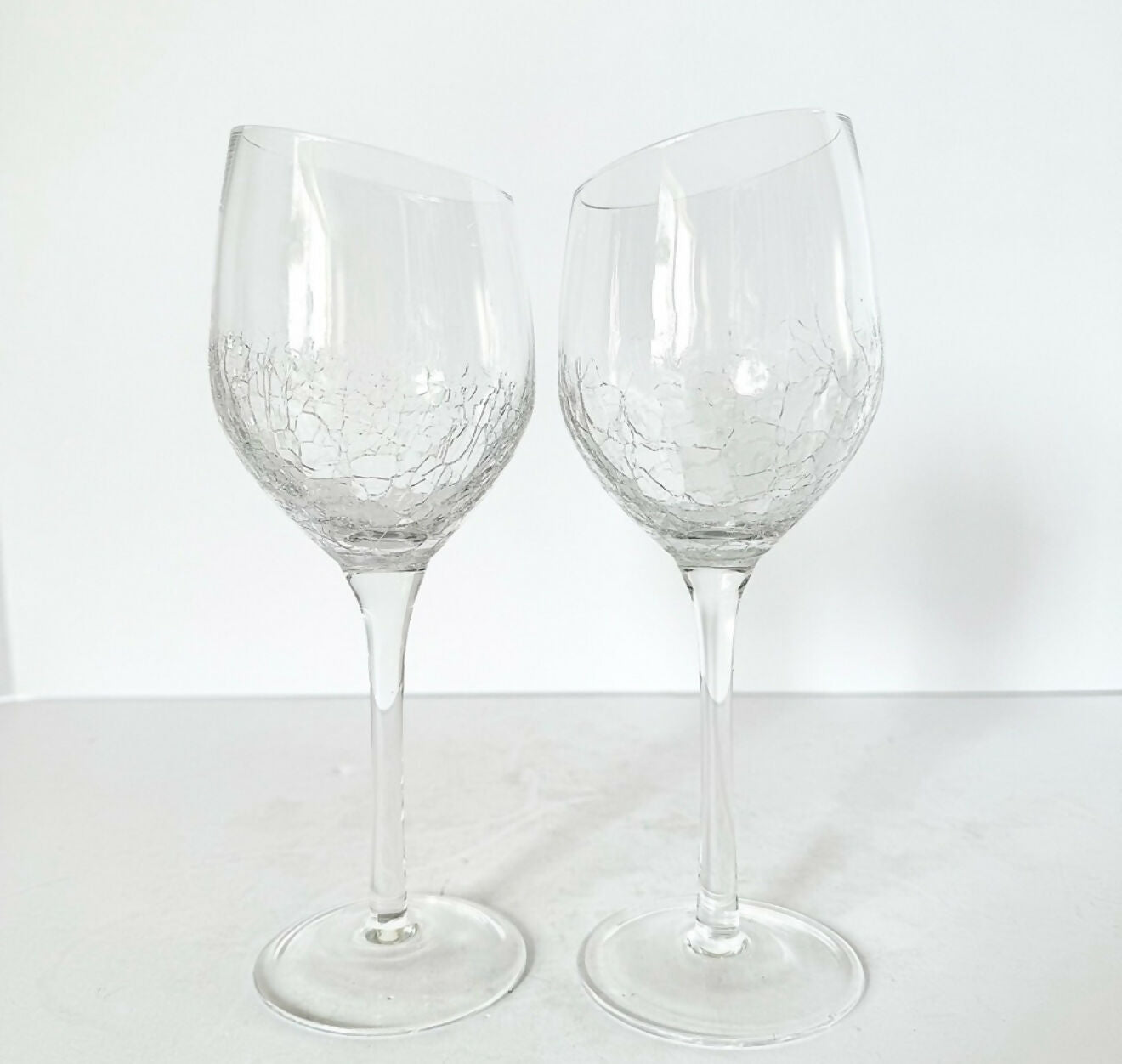Sip in style with this elegant set of 4 Pier 1 Angled Rim Crackle White Wine Goblets. Crafted from hand-blown glass with Pier 1’s signature crackle detailing and angled rim, each 12-ounce goblet adds sophistication to any table setting. This discontinued design blends delicate artistry with durability, making it a timeless addition for entertaining or collecting.