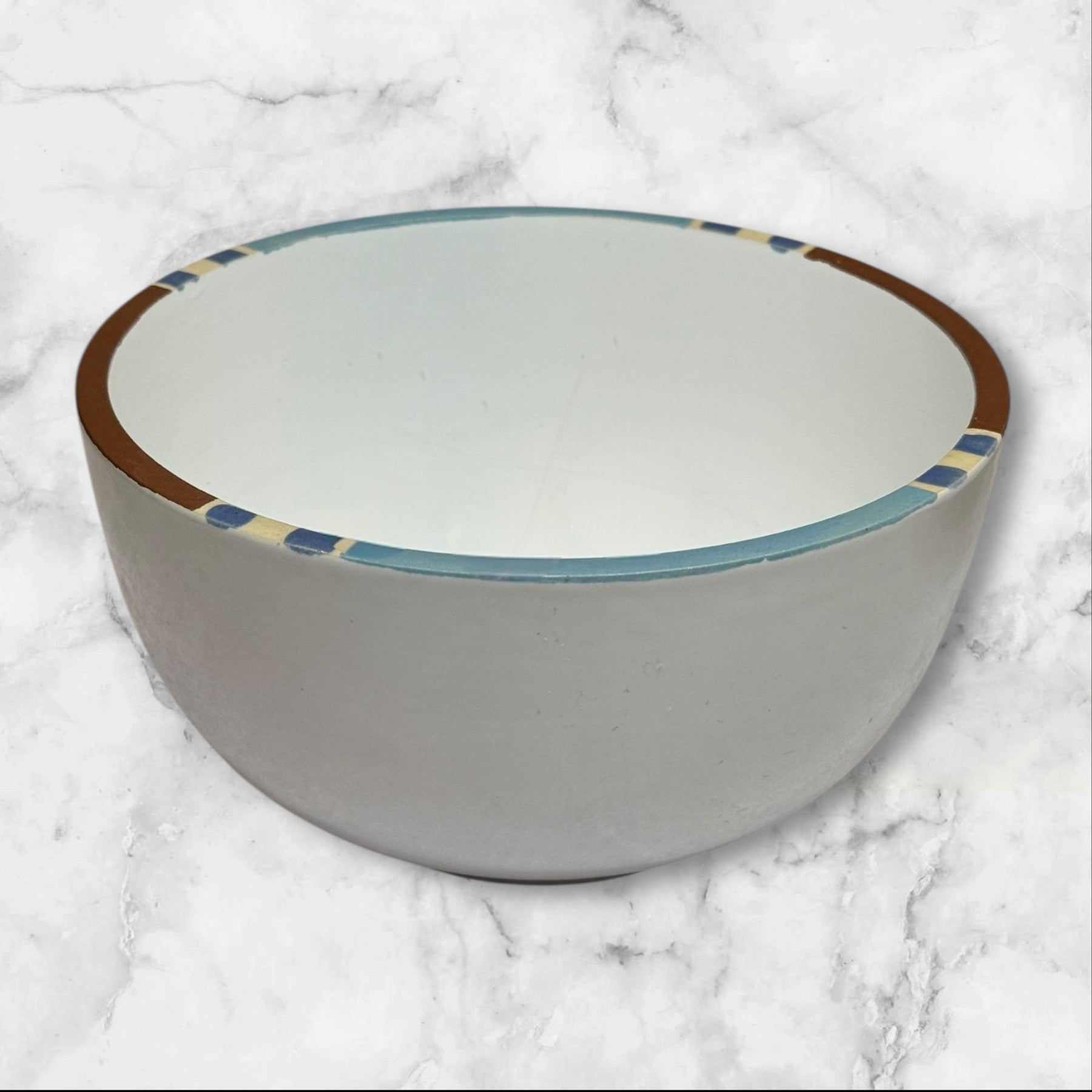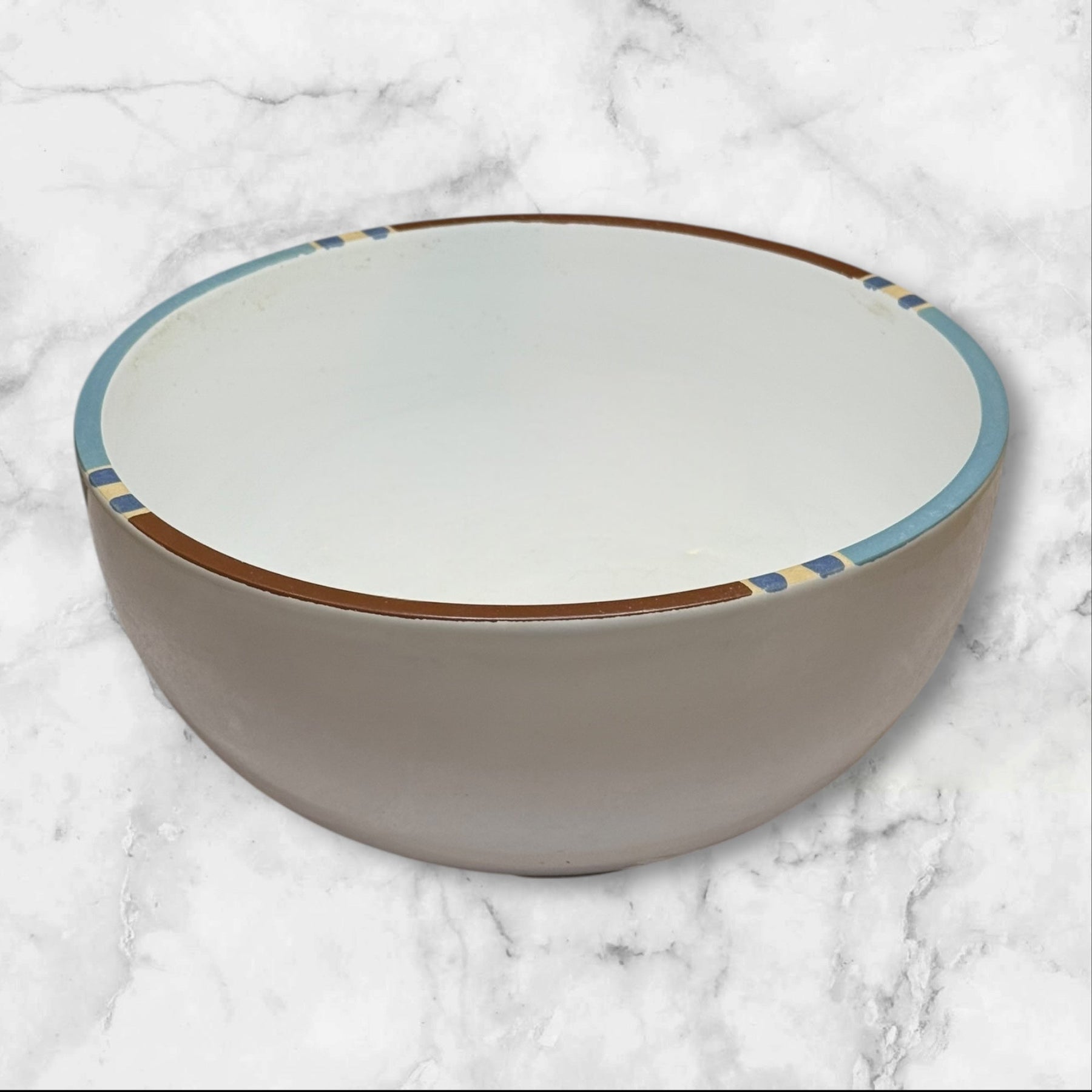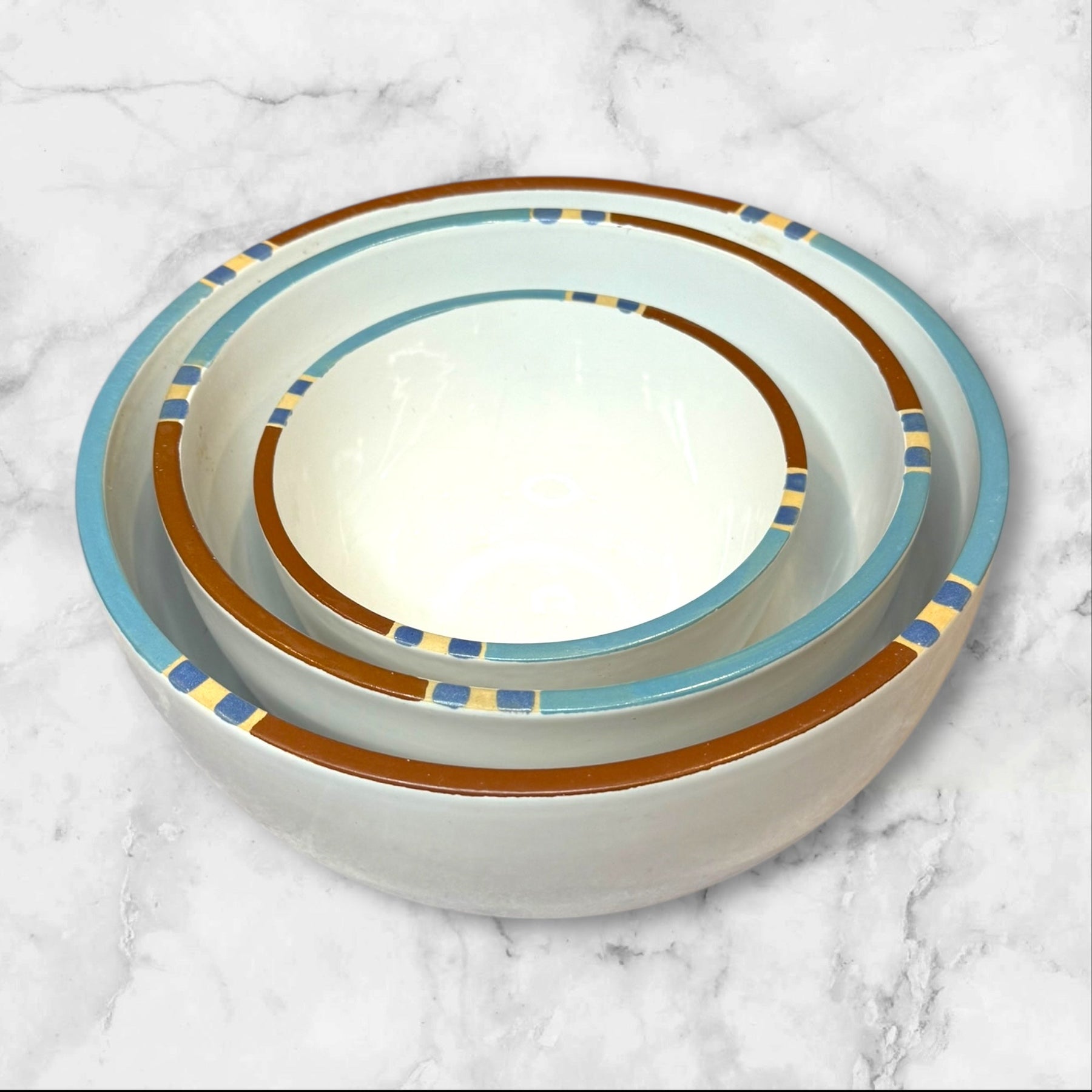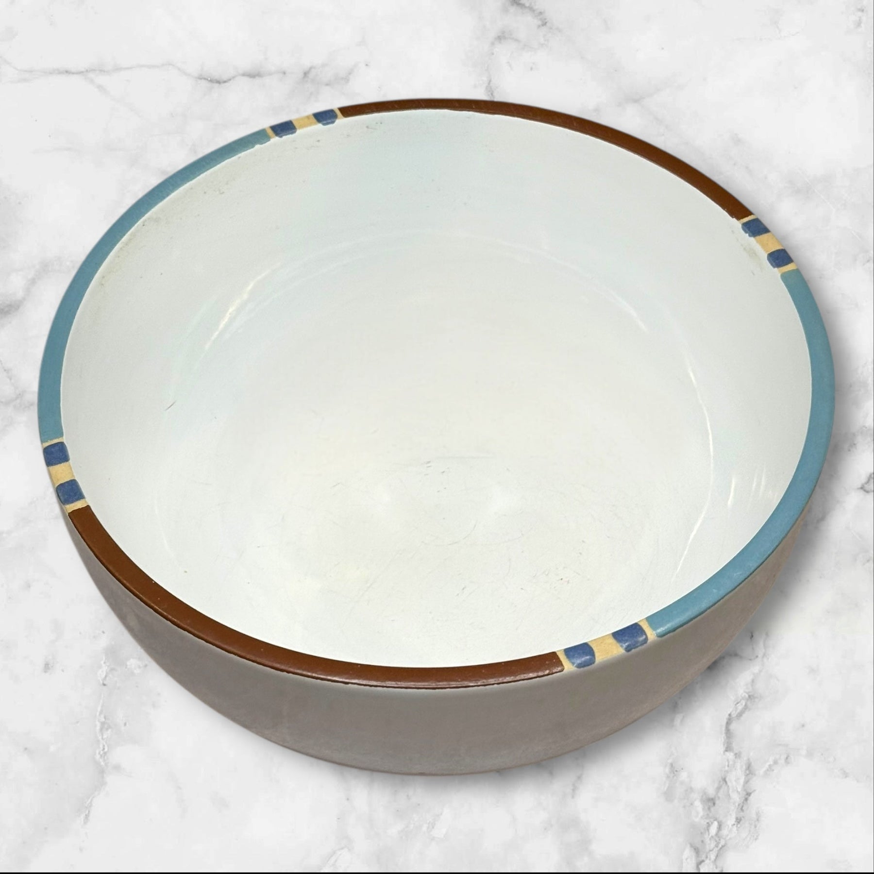 This Dansk Mesa White Sand 3-piece mixing bowl set, made in Portugal, features the signature hand-painted rim in teal, blue, and terra cotta. These durable ceramic bowls nest perfectly for easy storage and work beautifully for baking, prep, serving, or display. A discontinued and highly collectible Dansk pattern. All three bowls are in great condition with minor utensil marks from gentle use.