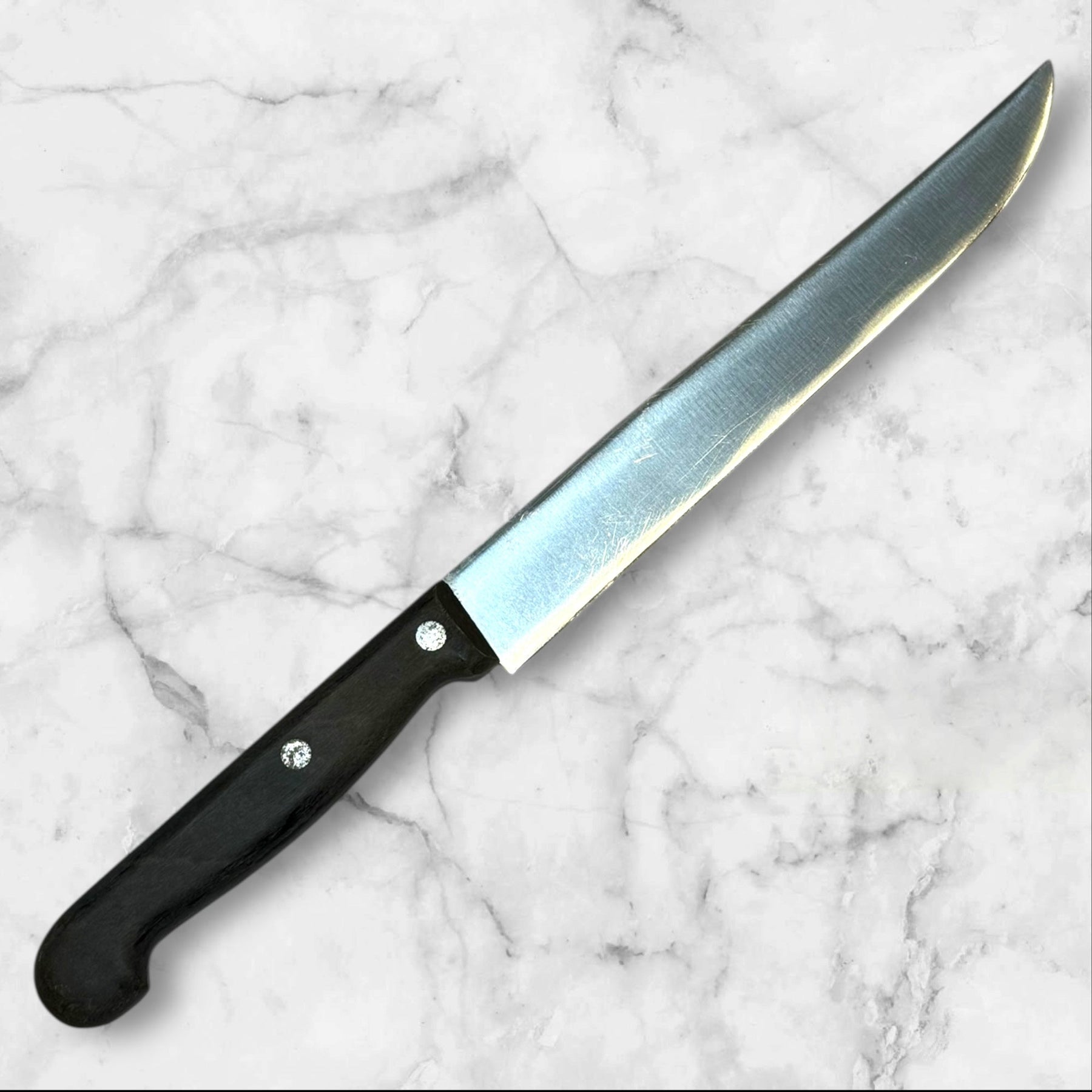 This vintage Henckels Zwillingwerk Friodur 731 slicing knife showcases Solingen-made stainless steel that has undergone the Friodur ice-hardening process for exceptional durability and edge retention. The long blade and classic riveted handle offer balance and precision, ideal for carving meats or slicing roasts. A desirable piece for collectors of German cutlery, this knife shows gentle vintage wear while remaining fully functional and well-preserved.