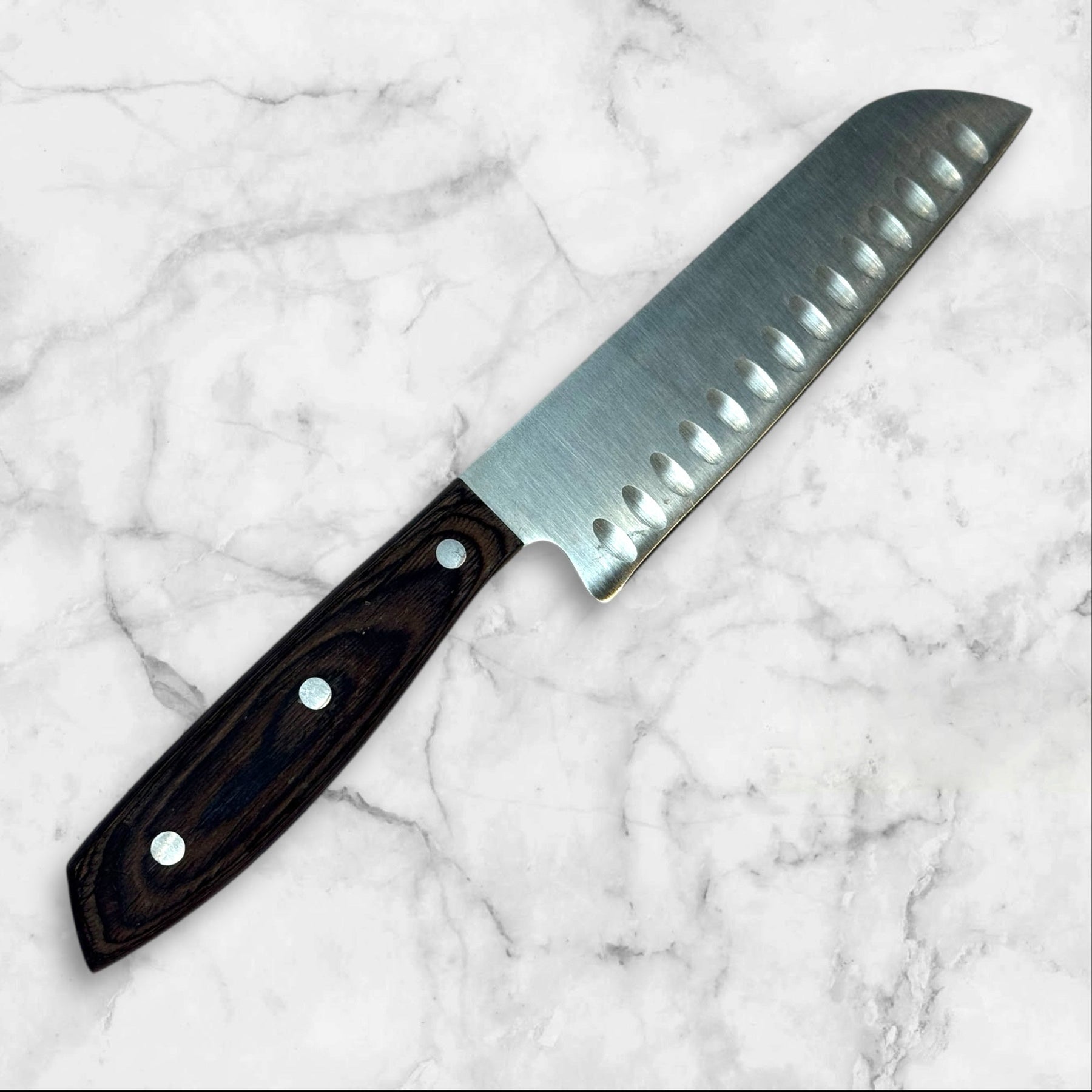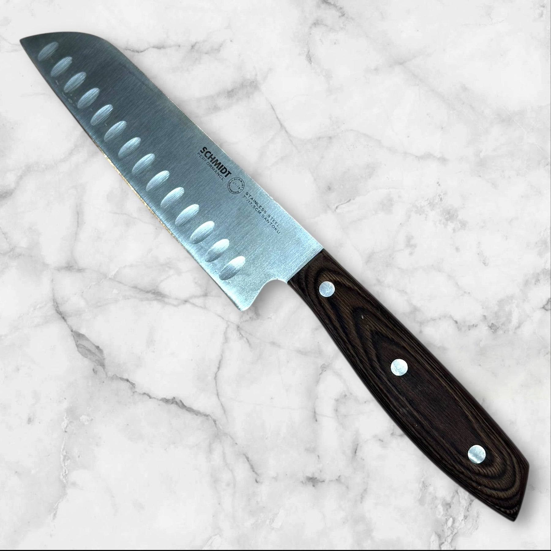 This Schmidt Bros. Bonded Ash Santoku knife features a sharp 7-inch stainless steel blade with hollow-ground indentations for smoother, friction-free slicing. Part of the premium Bonded Ash Collection (retail $449.95 for the full set), it includes the signature layered ash wood handle and full-tang construction for excellent balance and durability. Light wear from gentle use. A high-end, versatile kitchen knife perfect for daily prep.