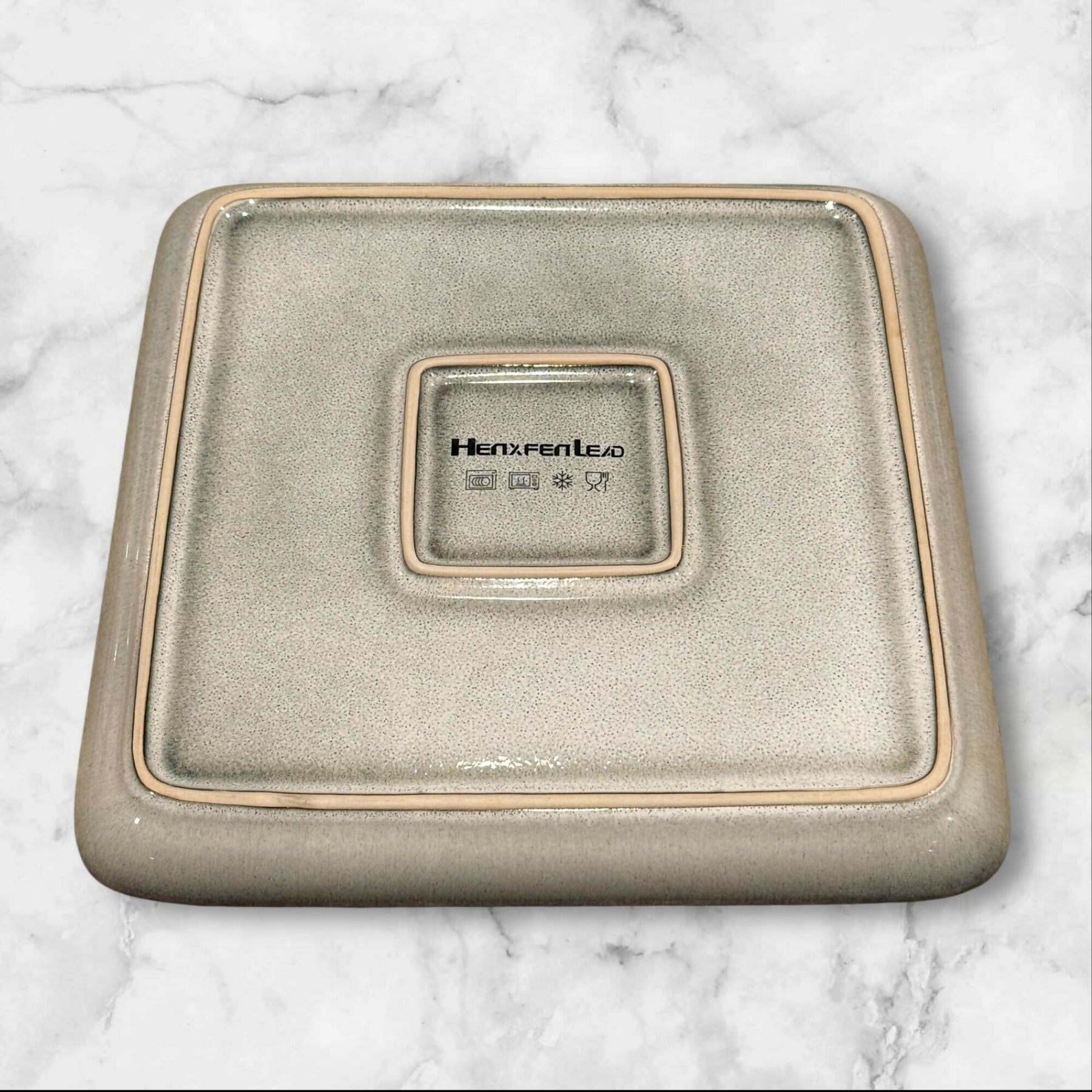 Serve steak, pasta, or salads in style with this set of 4 Henxfen Lead square dinner plates. Crafted from durable stoneware with a reactive red glaze, these plates feature a bold artisanal finish and a substantial feel. Measuring 10 7/8” wide (14.25” corner-to-corner), they bring both function and beauty to your table. Excellent condition, nearly perfect, with brilliant color and handcrafted charm.
