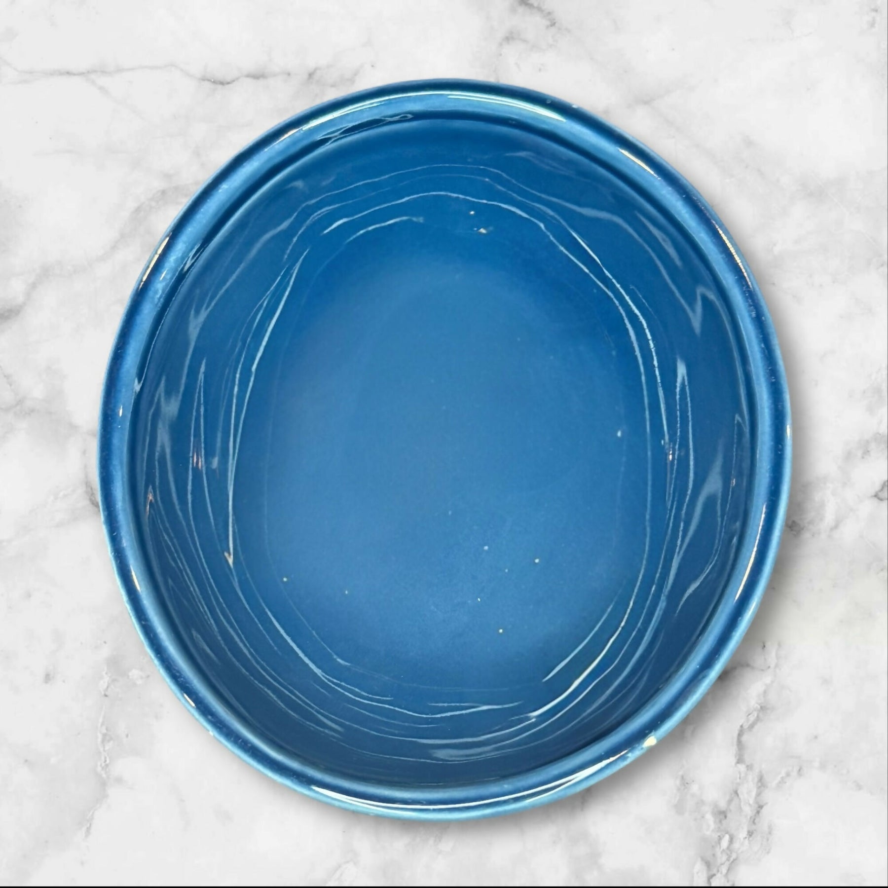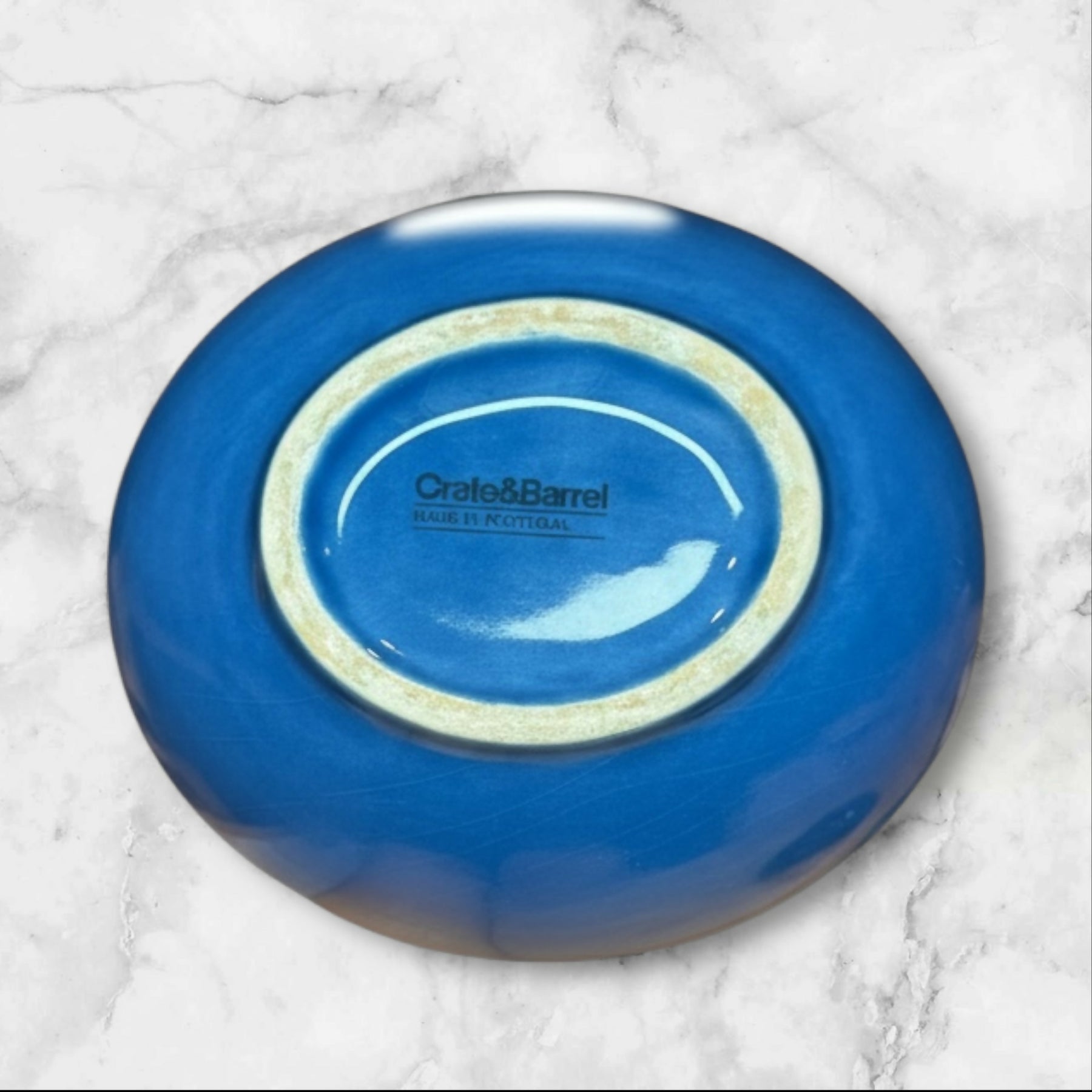 Beautiful and richly glazed, this set of three Crate & Barrel Portugal blue oval bowls features an artisan swirl finish in deep ocean blue. Each measures approximately 6 3/8″ x 5.75″ x 2.5″. Two bowls have small rim chips and light crazing consistent with age and use. Perfect for side dishes, soups, or décor. A discontinued and collectible Crate & Barrel stoneware design.