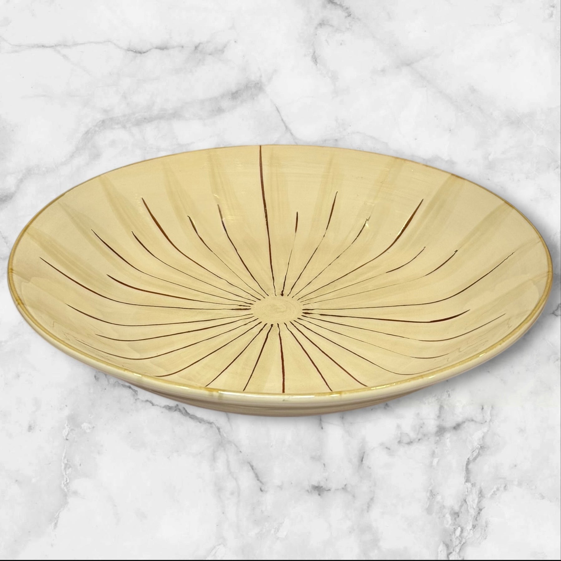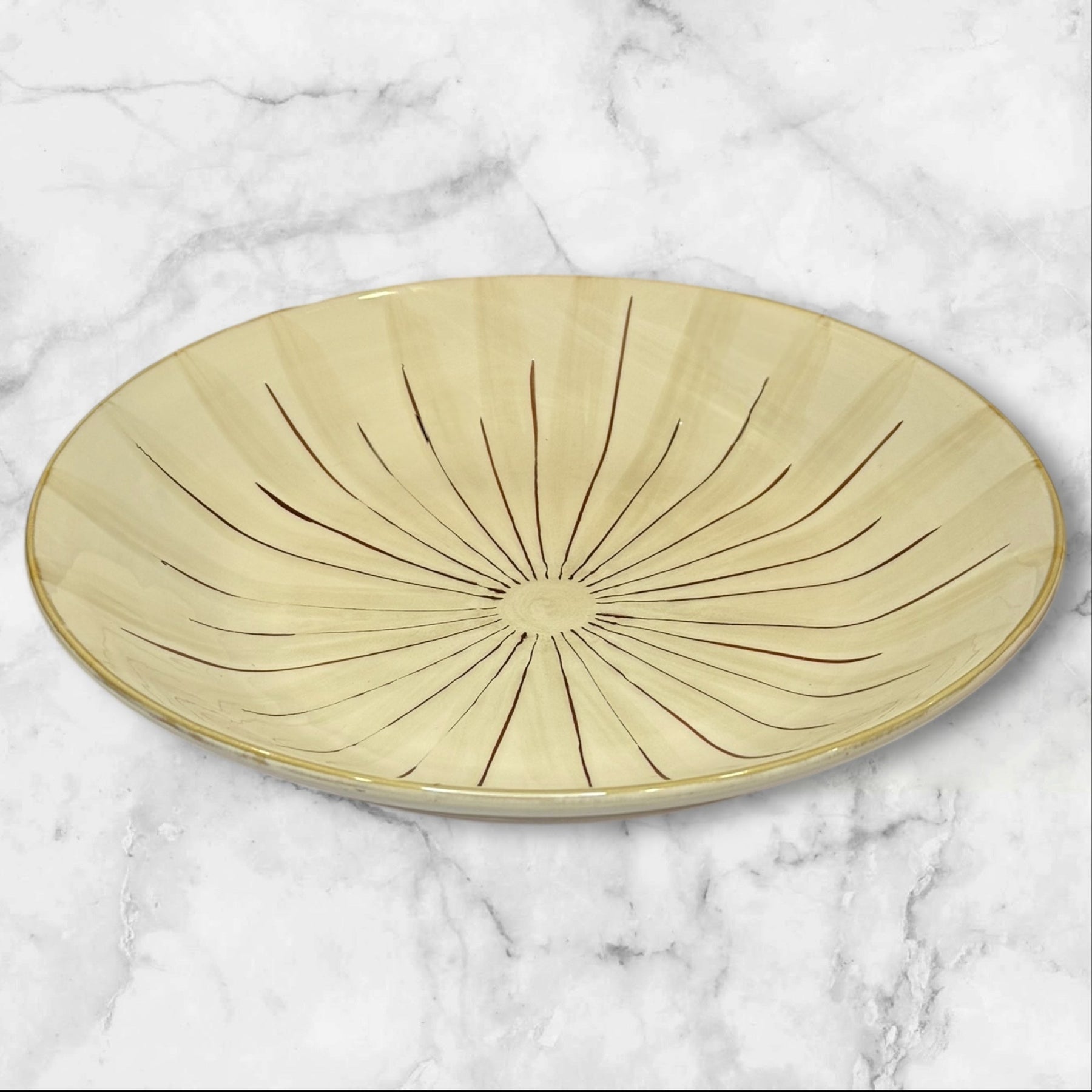 Bring warm, organic style to your table with this Pier 1 Sanctuary 13-inch serving bowl. Crafted with a natural tan glaze and etched radial line design, this generously sized bowl is ideal for salads, pasta, fruit, or a decorative centerpiece. A discontinued and desirable Pier 1 piece, it complements rustic, farmhouse, and neutral décor. The bowl is in excellent gently used condition with minimal wear.