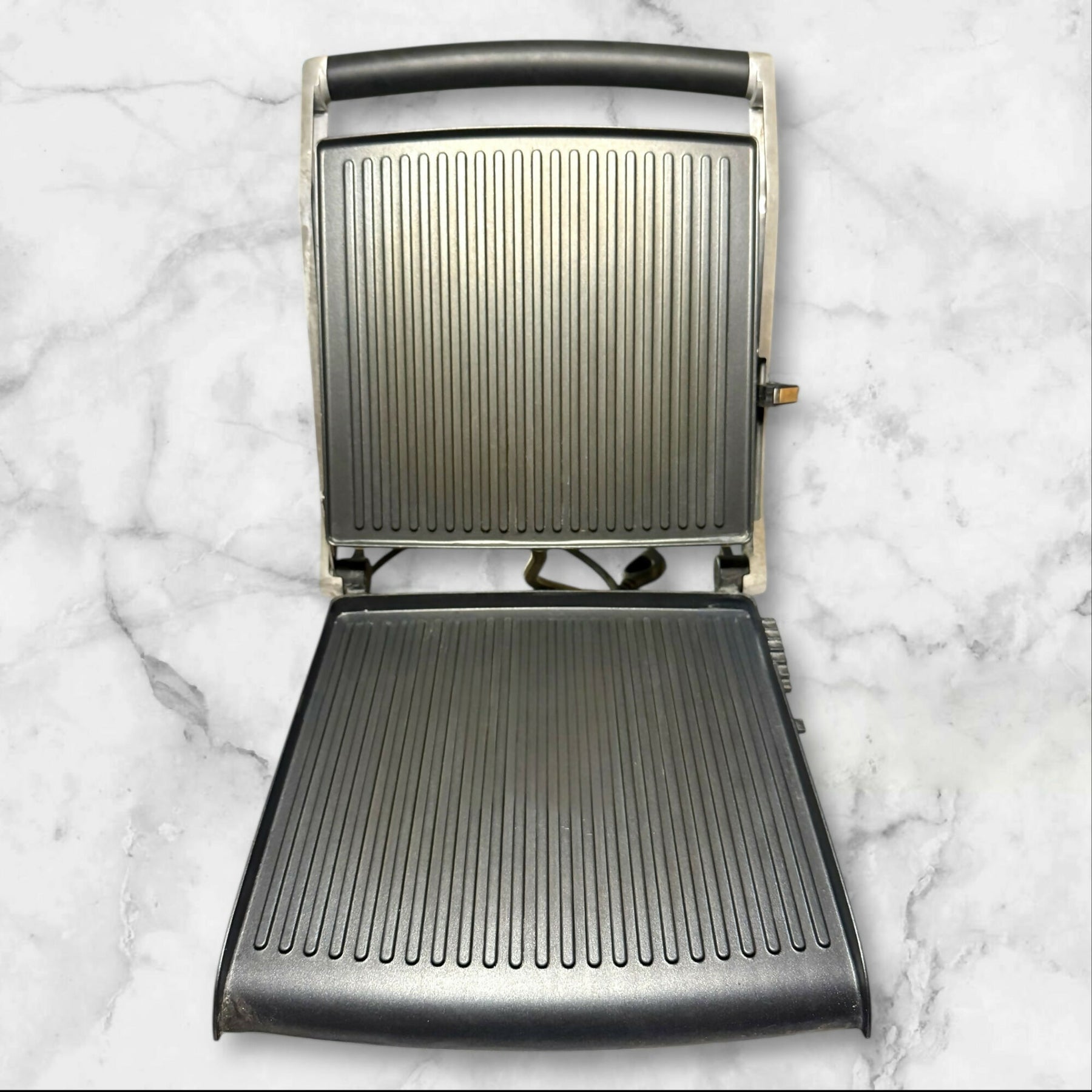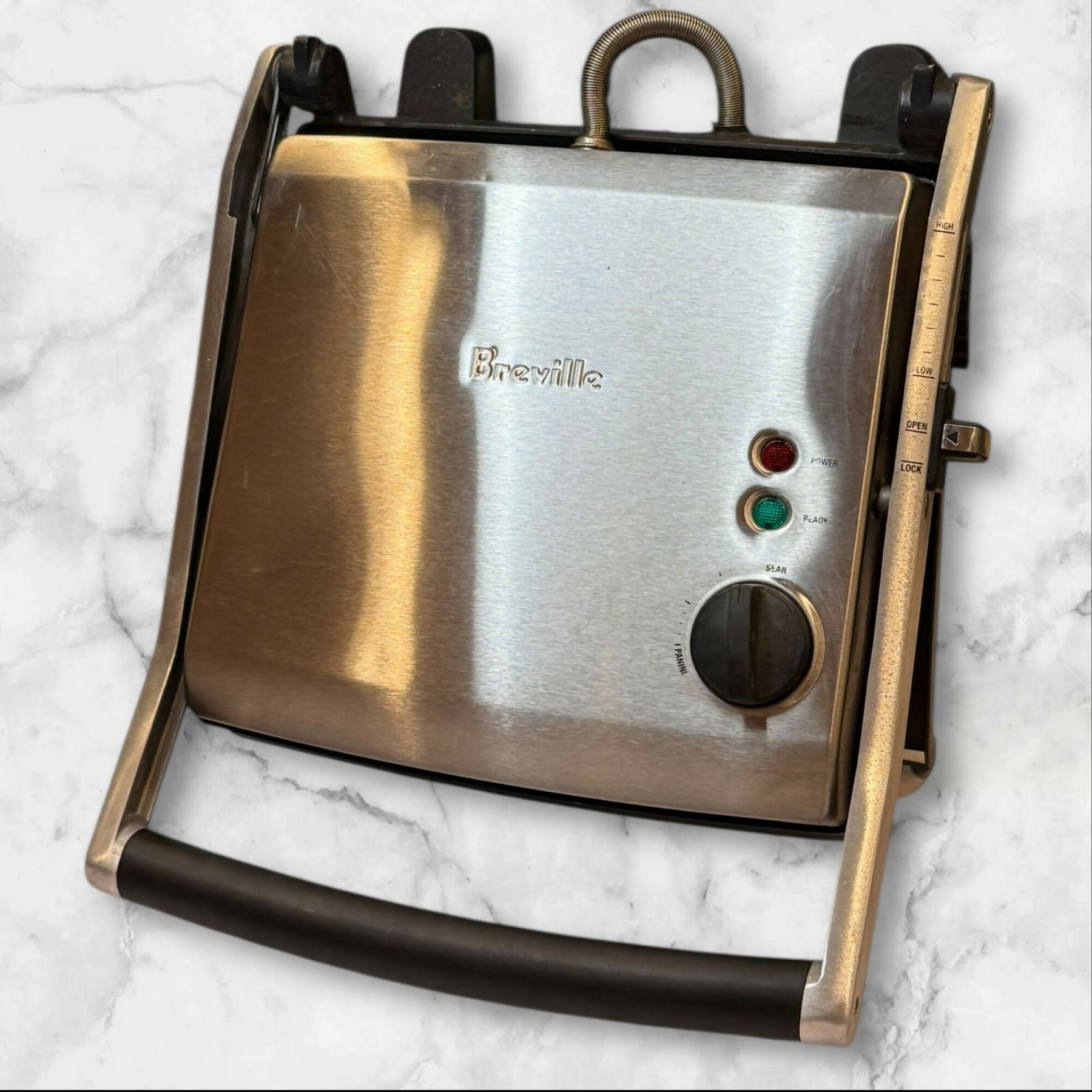 Enjoy café-style sandwiches and grilled favorites at home with the Breville BGR200XL Contact Grill. This 1500-watt stainless-steel grill features nonstick ribbed plates for even cooking and perfect sear marks. It heats quickly and cleans easily, making it ideal for everyday use. Light scratches and a small dent on the exterior do not affect performance — the cooking surface is excellent and fully functional. A reliable Breville appliance built to last.