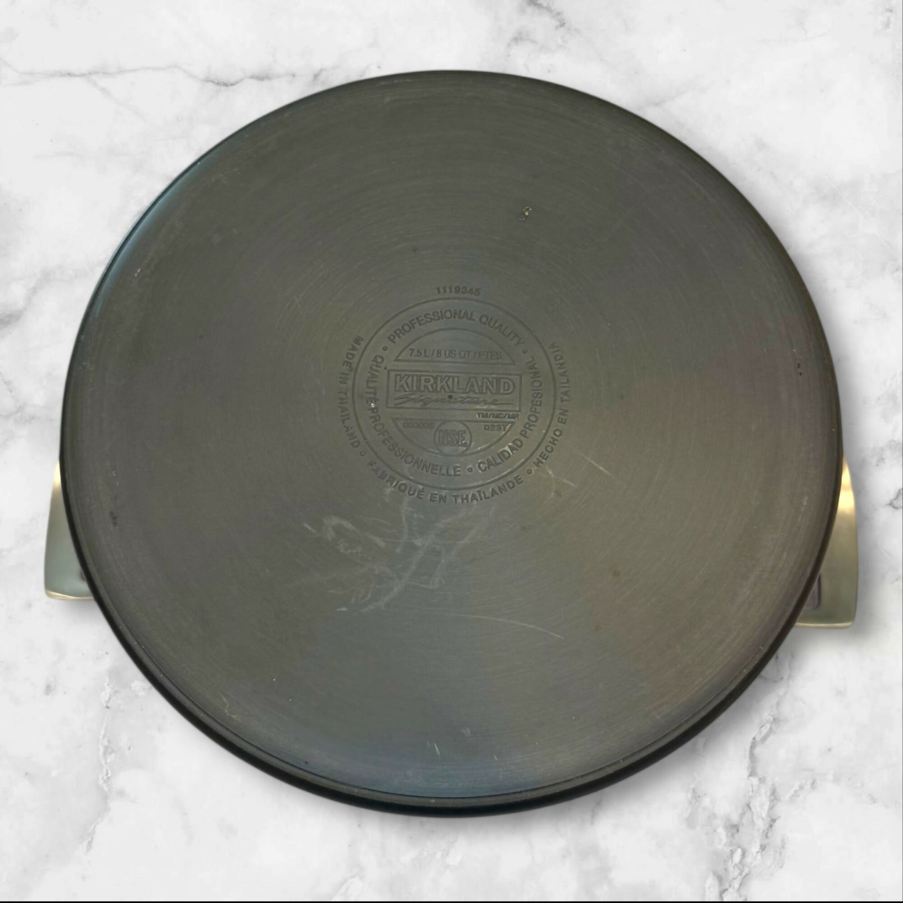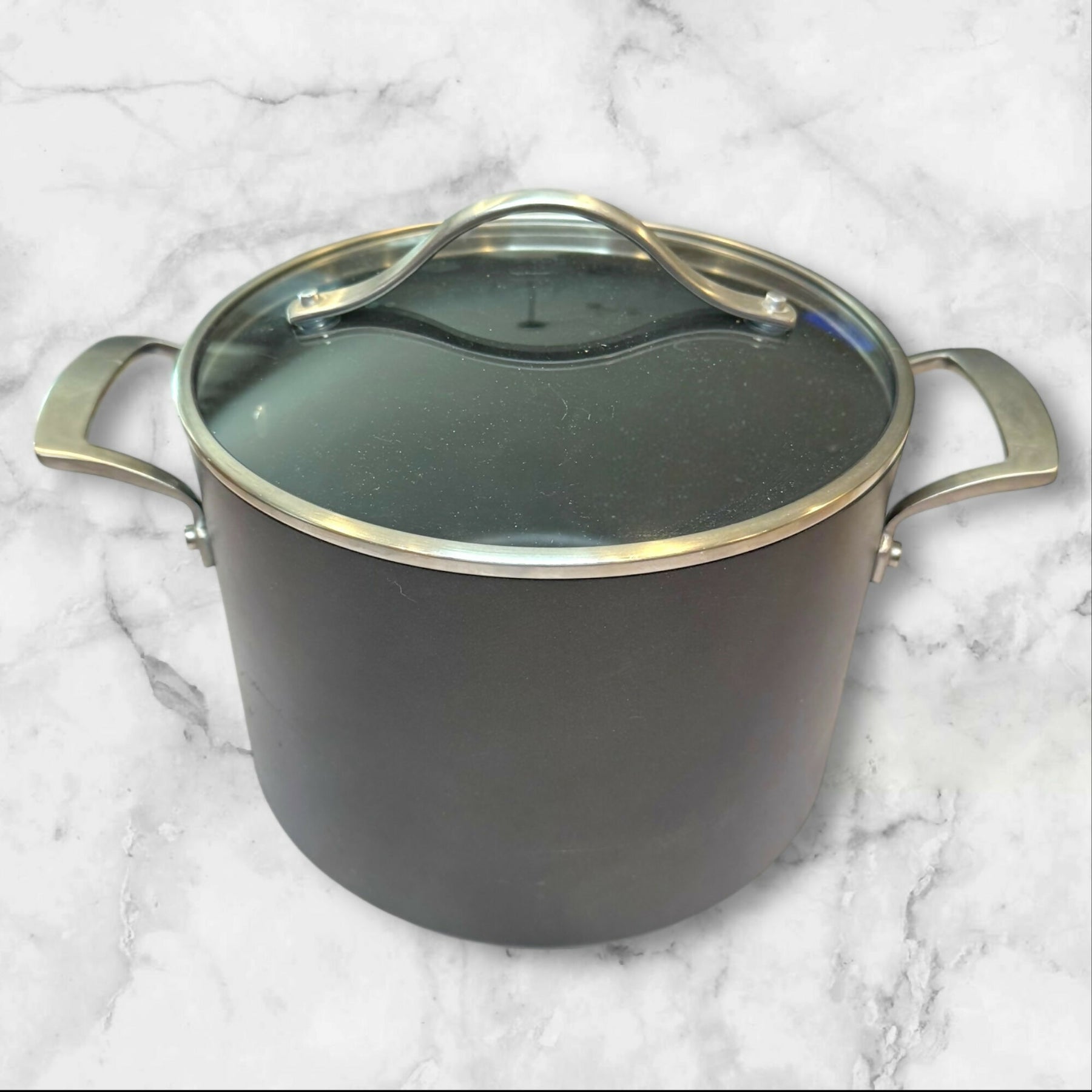 This Kirkland Signature 8-quart hard-anodized stock pot is built for performance and large-batch cooking. The nonstick interior is in excellent shape with a smooth, like-new surface, and the exterior body remains clean with only light handling marks. The bottom shows heavy wear from normal stovetop use, but it does not affect cooking performance. Includes a tempered glass lid. Perfect for soups, stews, pasta night, and meal prepping.