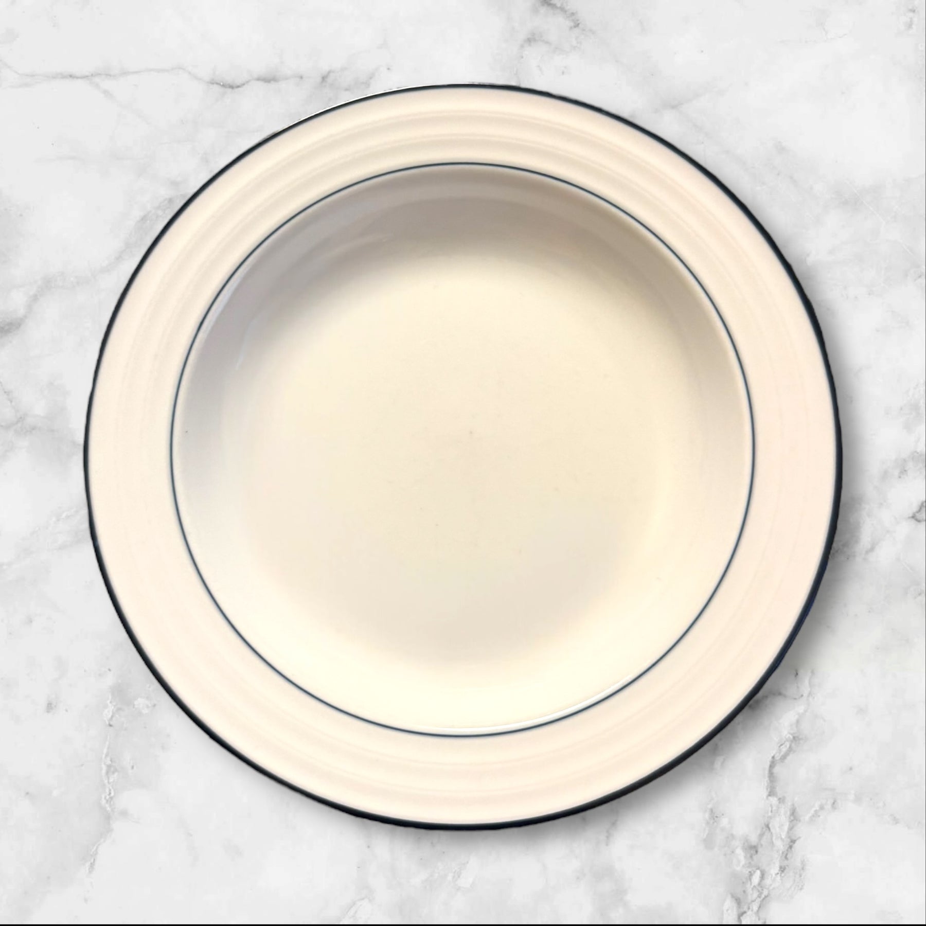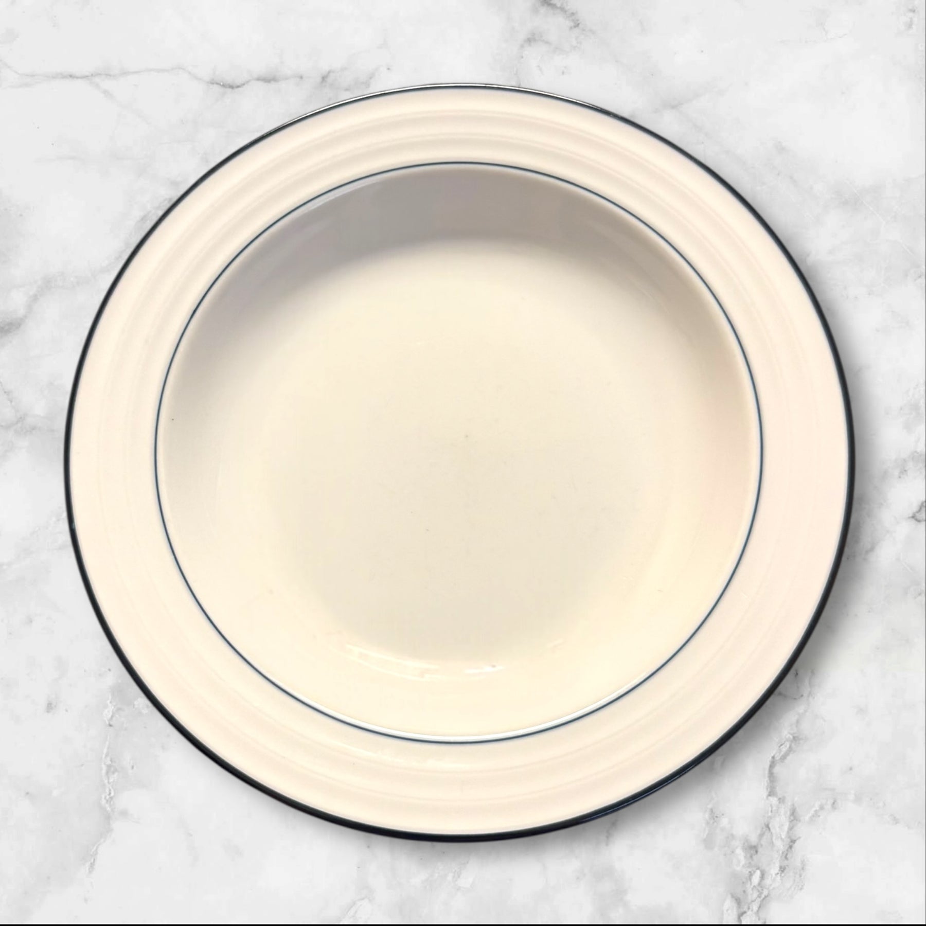 Serve soups, salads, or pastas with this elegant set of 6 rimmed bowls from Crate & Barrel’s Roulette Blue collection. Made in Portugal from SPAL porcelain, these 9” bowls feature a classic white base with a refined navy blue rim. All are in excellent condition with no chips or cracks.