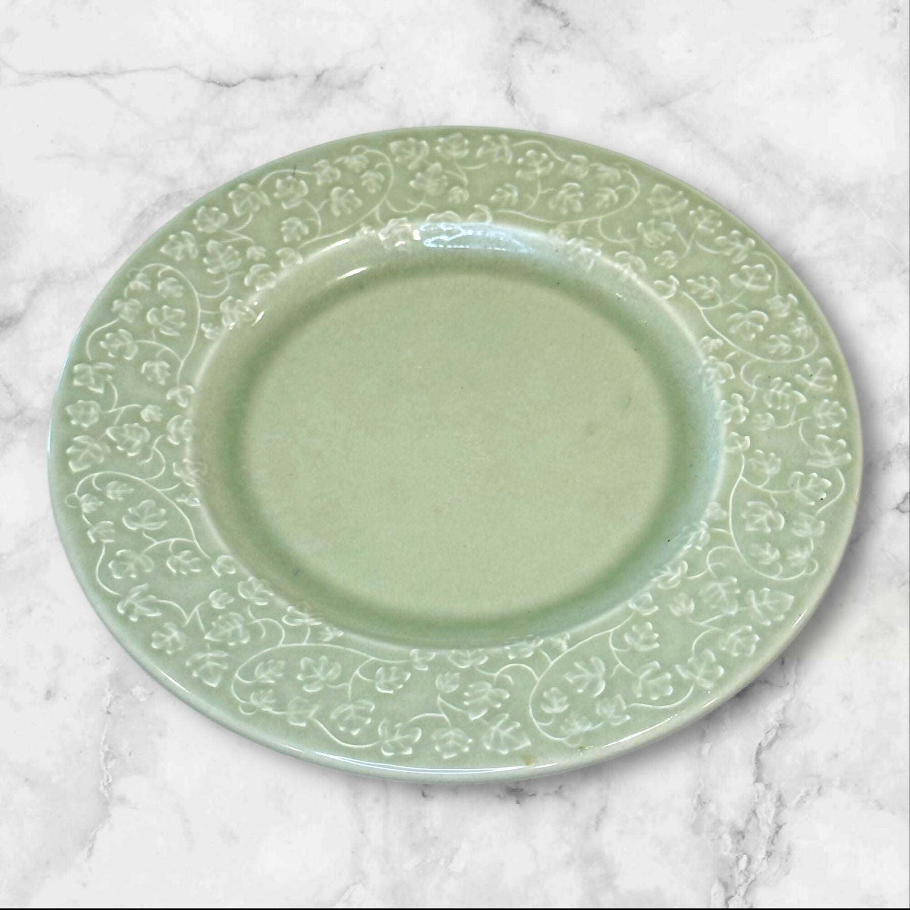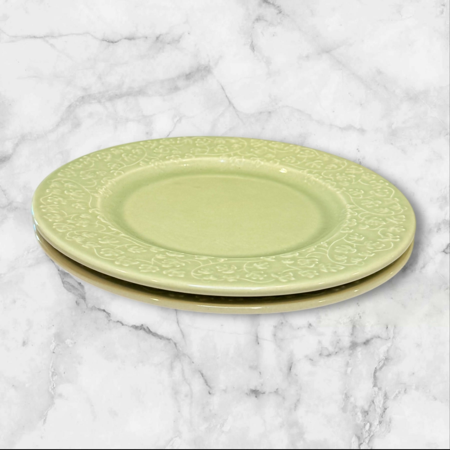 Elevate everyday dining with this elegant set of Lierre embossed salad plates from World Market. Crafted in France, these plates feature a soft green glaze and raised floral detailing that adds charm to any table. Their versatile size makes them perfect for salads, desserts, or light meals. Durable ceramic construction ensures long-lasting use, making them ideal for daily dining or entertaining.