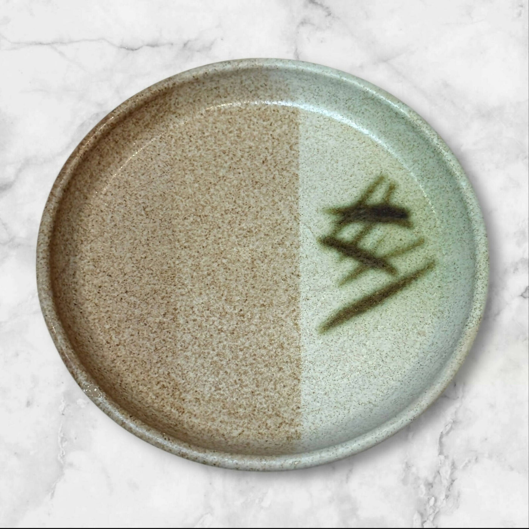 Bring artisanal charm to your table with this beautiful set of 8 hand-thrown stoneware plates, signed Aries. Each plate features a unique two-tone glaze—warm speckled brown blended with soft sage and cream—accented by hand-painted brushwork. The organic shape and rustic finish give these plates a modern farmhouse and wabi-sabi appeal. All pieces are in excellent condition with only minimal signs of use. Perfect for collectors, pottery lovers, or anyone who appreciates handcrafted quality.