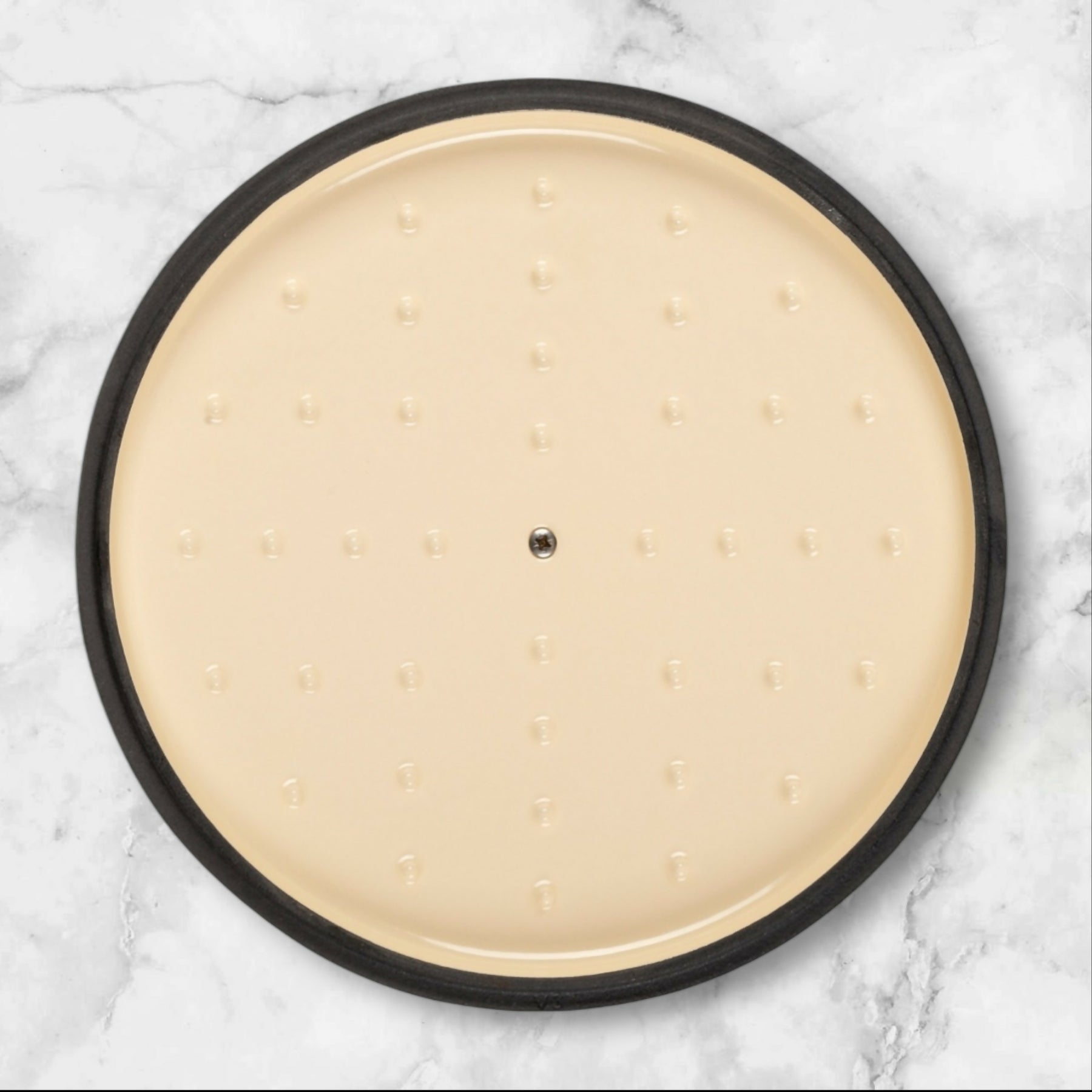 The Ballarini Bellamonte Dutch Oven offers exceptional heat retention and timeless Italian design. Crafted from durable cast iron and finished in a smooth white enamel, this 5.75 quart pot is perfect for braising, simmering, roasting, baking, and serving. The interior enamel promotes even cooking and easy cleanup, while the gold tone knob adds a refined touch. This Dutch oven is brand new in box and ready to elevate any kitchen.