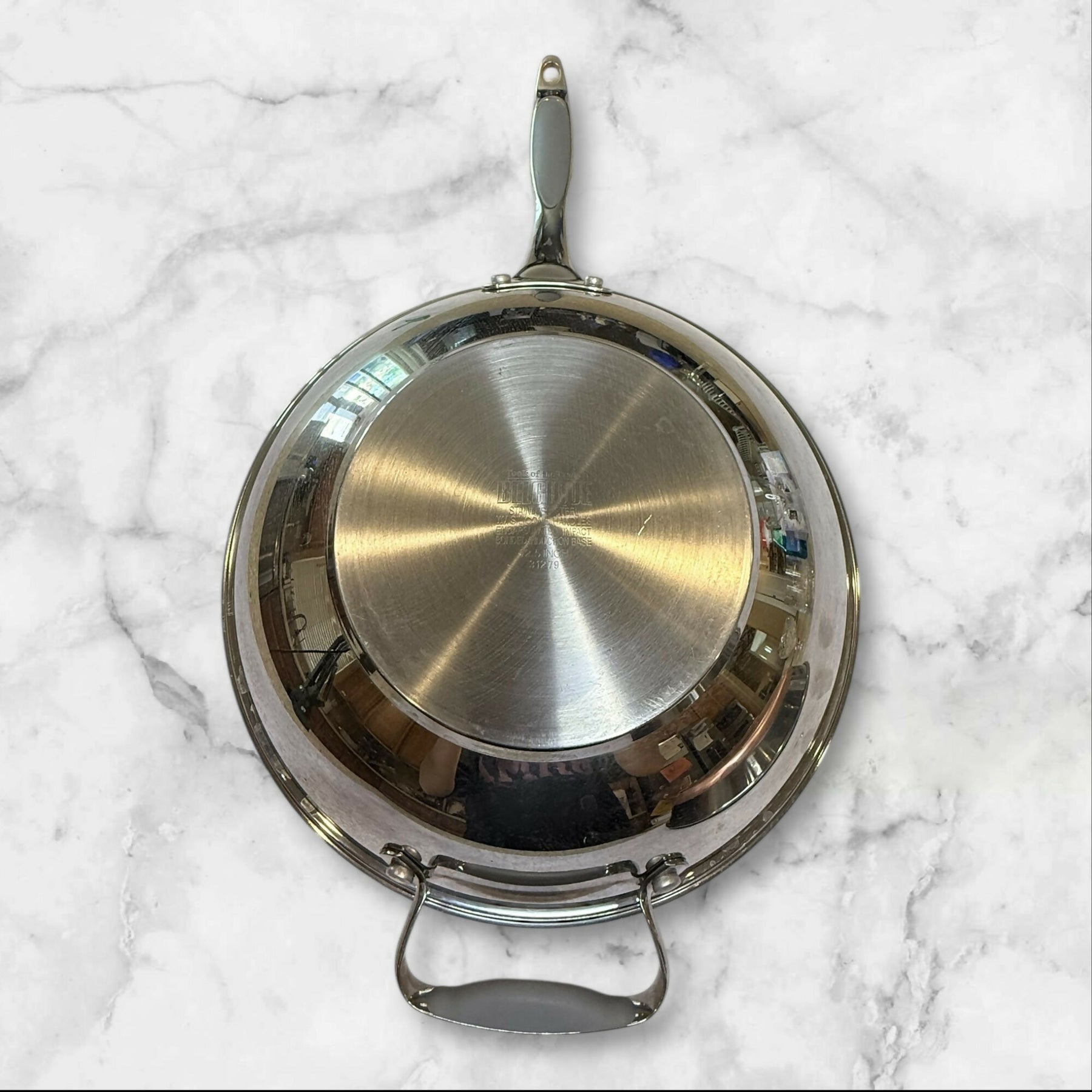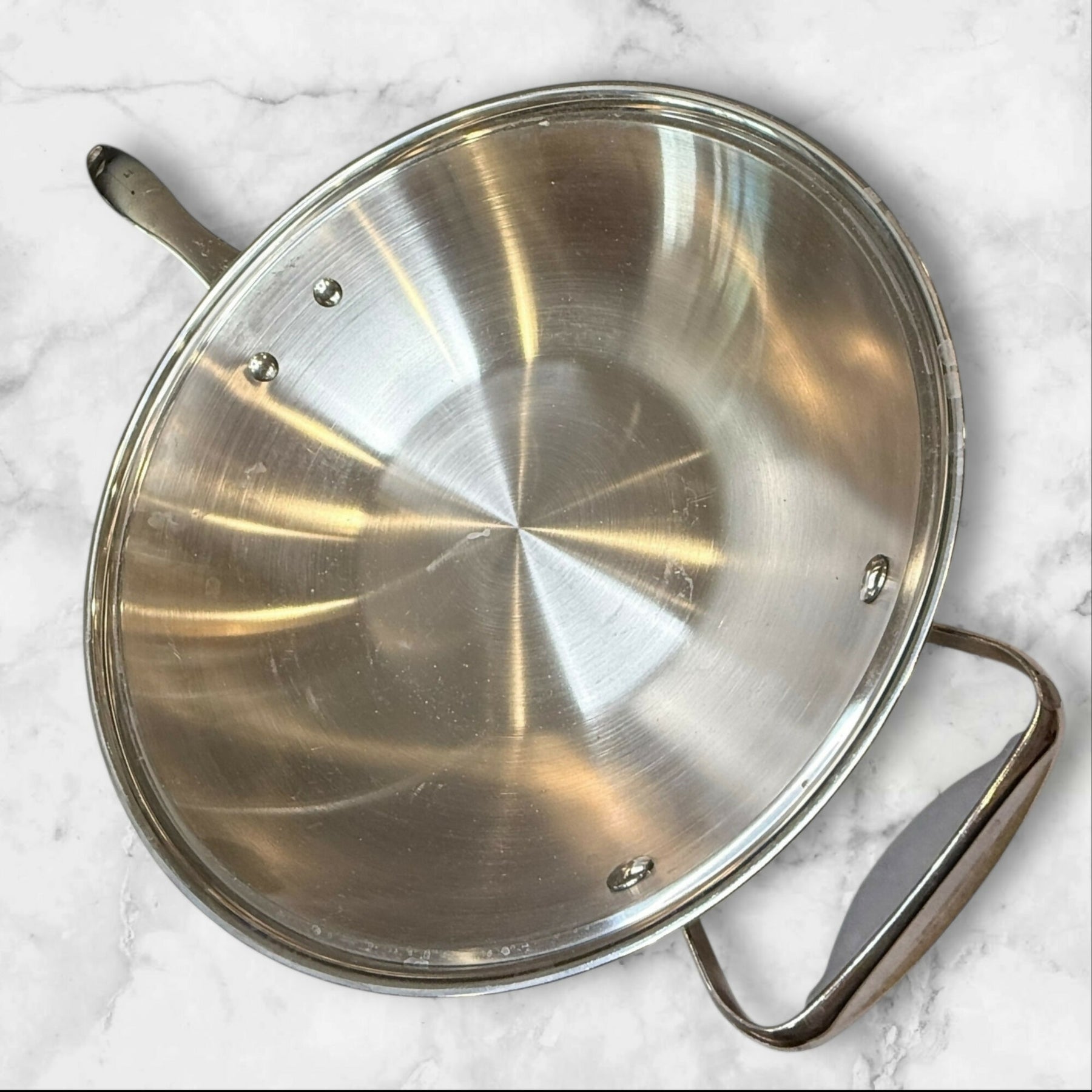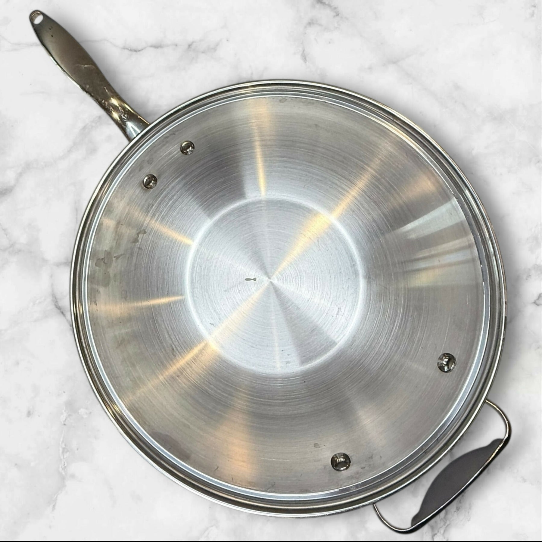 This Belgique Tools of the Trade 12.5-inch stainless steel wok offers exceptional heat distribution and durability, ideal for stir-frying, sautéing, and everyday cooking. Designed with a comfortable rubberized handle and an encapsulated induction base, it performs beautifully across all stovetops. Its brushed interior shows light wear typical of gentle use, while the polished exterior adds style to any kitchen. A versatile, reliable piece for home chefs.