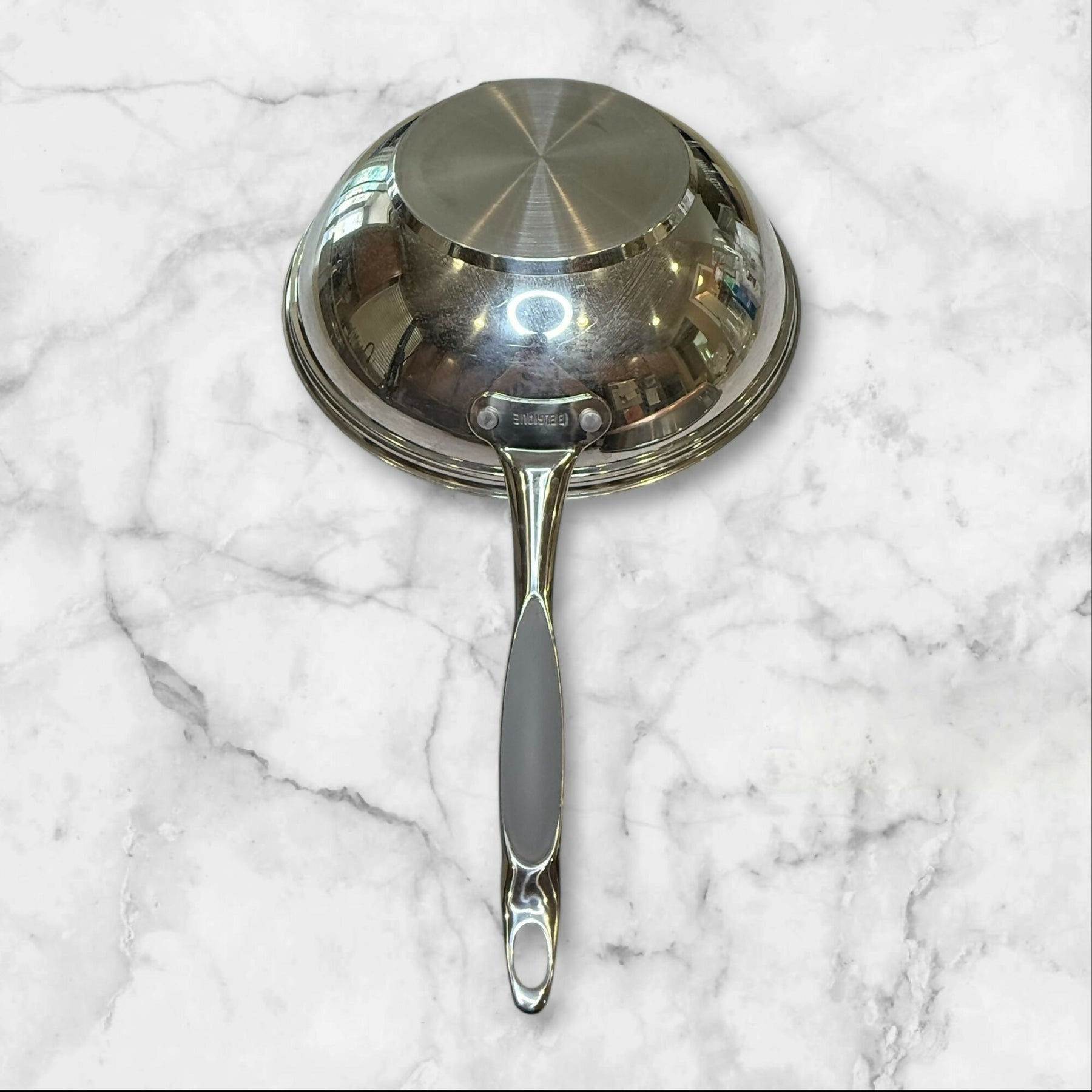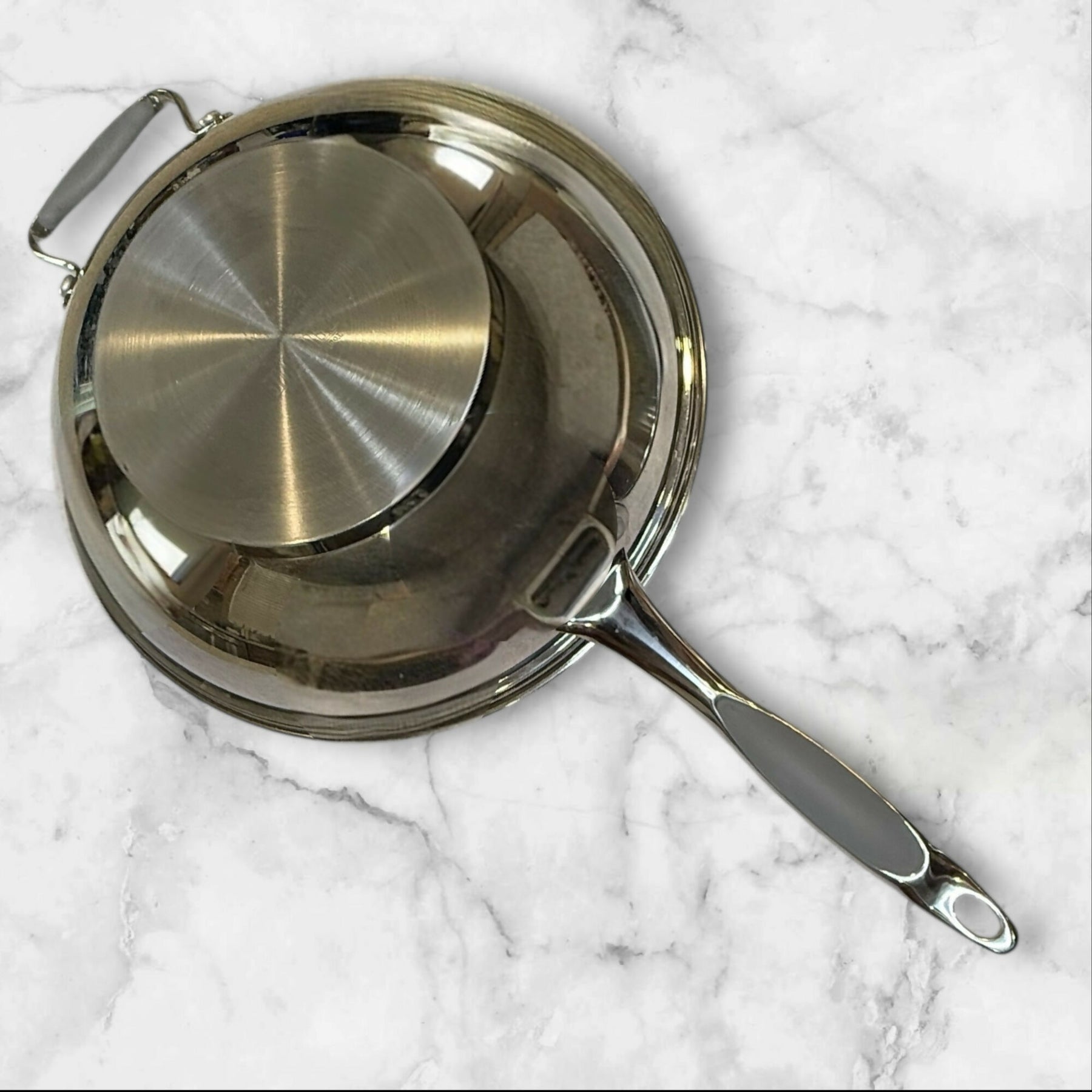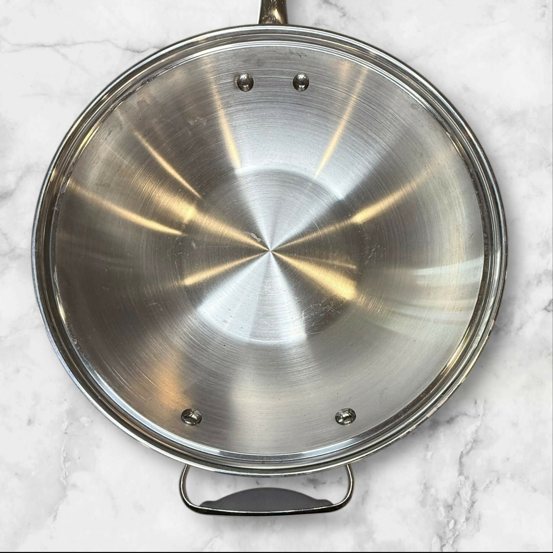 This Belgique Tools of the Trade 12.5-inch stainless steel wok offers exceptional heat distribution and durability, ideal for stir-frying, sautéing, and everyday cooking. Designed with a comfortable rubberized handle and an encapsulated induction base, it performs beautifully across all stovetops. Its brushed interior shows light wear typical of gentle use, while the polished exterior adds style to any kitchen. A versatile, reliable piece for home chefs.