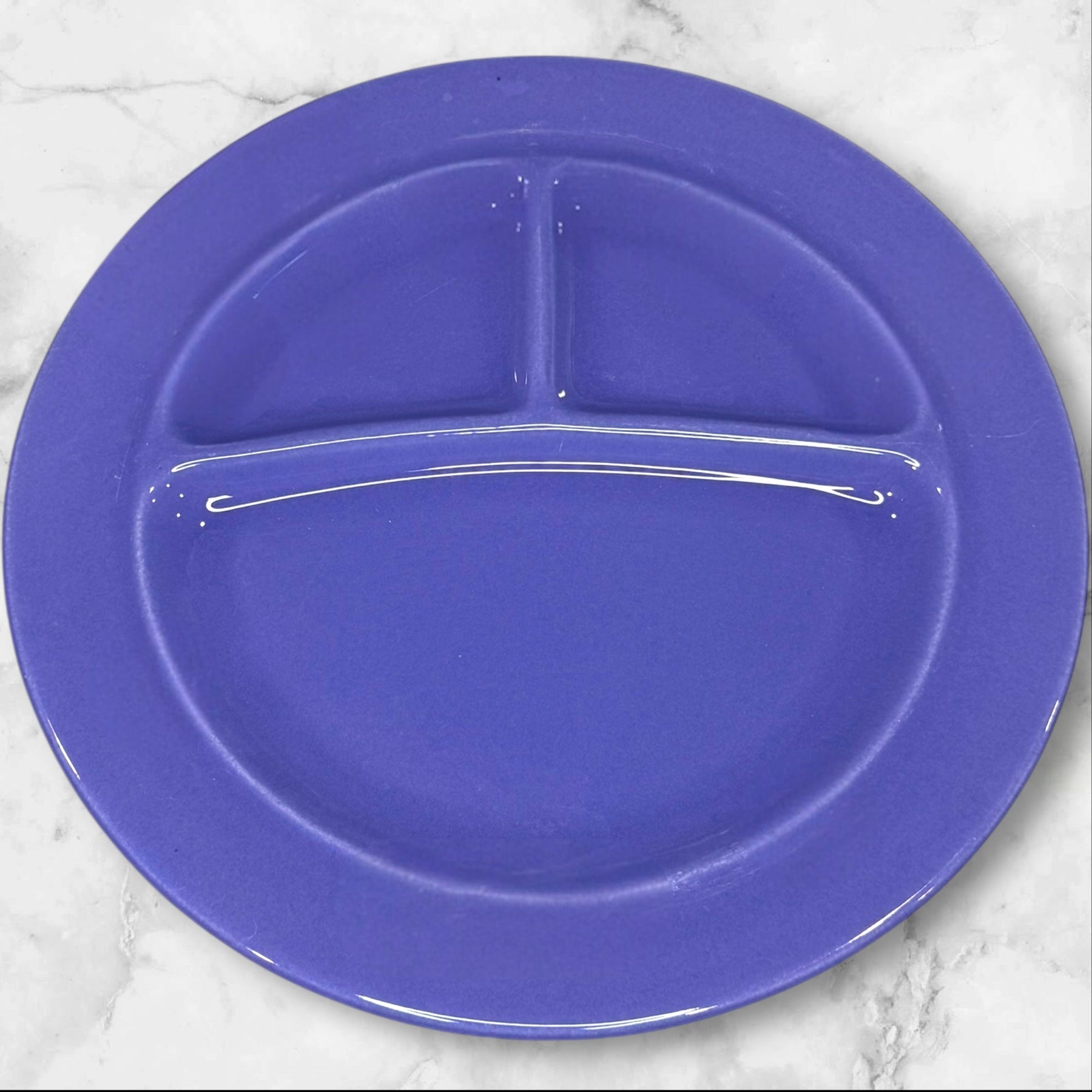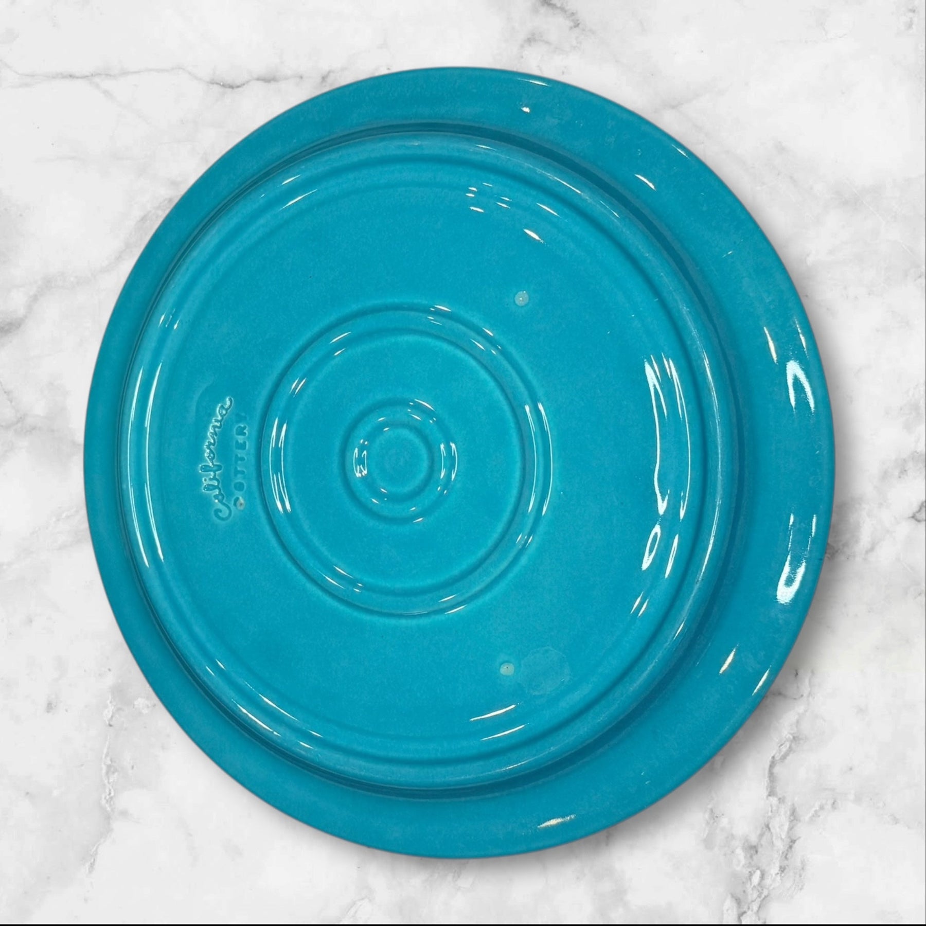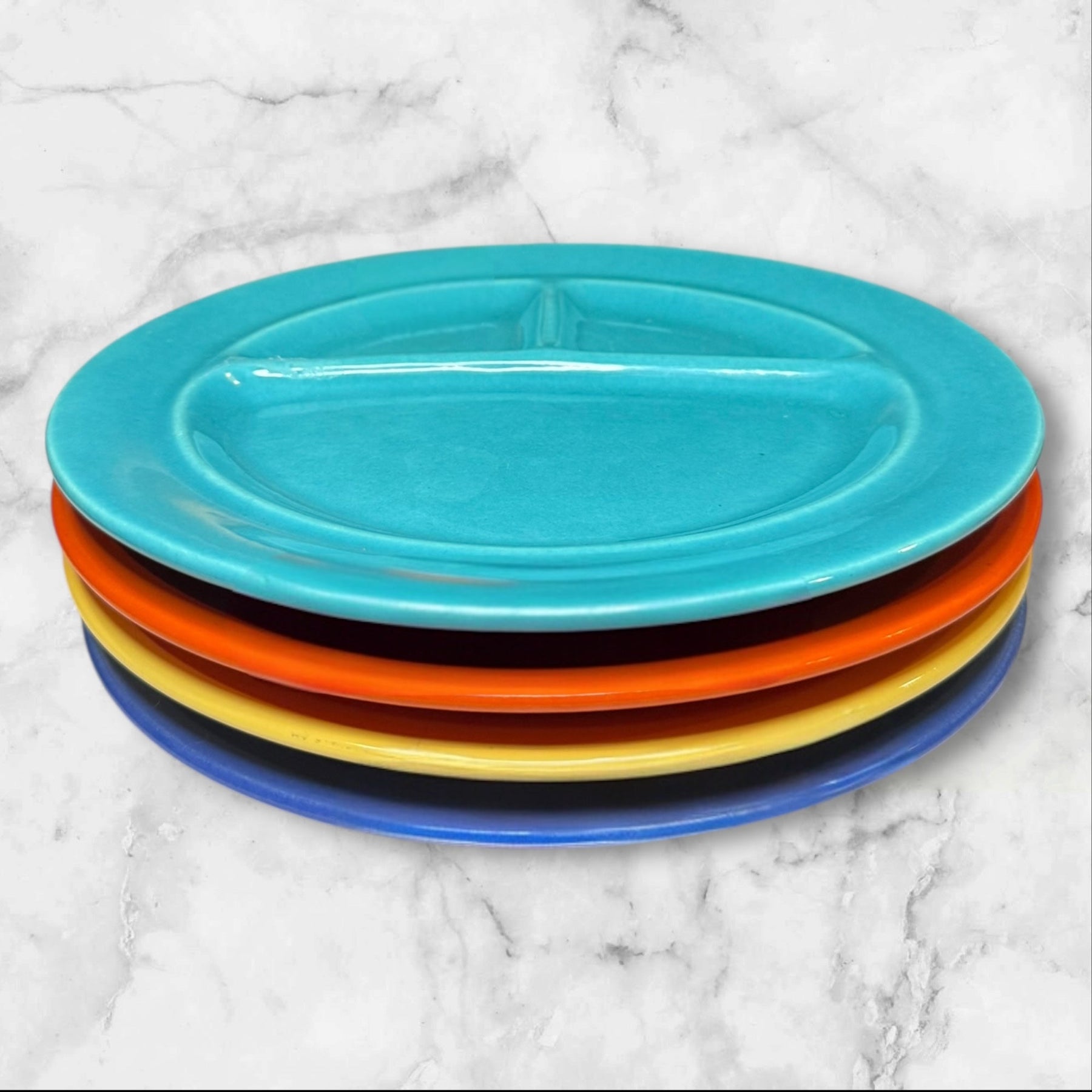 Add vintage charm to your table with this colorful set of 4 California Pottery divided grill plates. Crafted in the USA, each plate features classic mid-century sectioned styling perfect for barbecues, everyday meals, or display. The set includes yellow, orange, turquoise, and blue plates. All are gently used; the yellow plate has a surface crack that does not go through. A vibrant, functional addition for collectors and retro kitchen lovers.