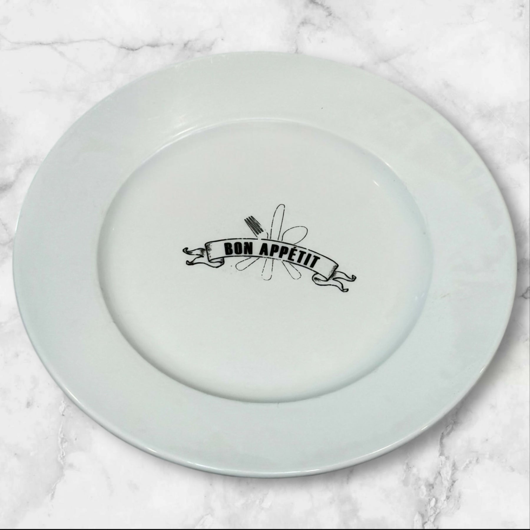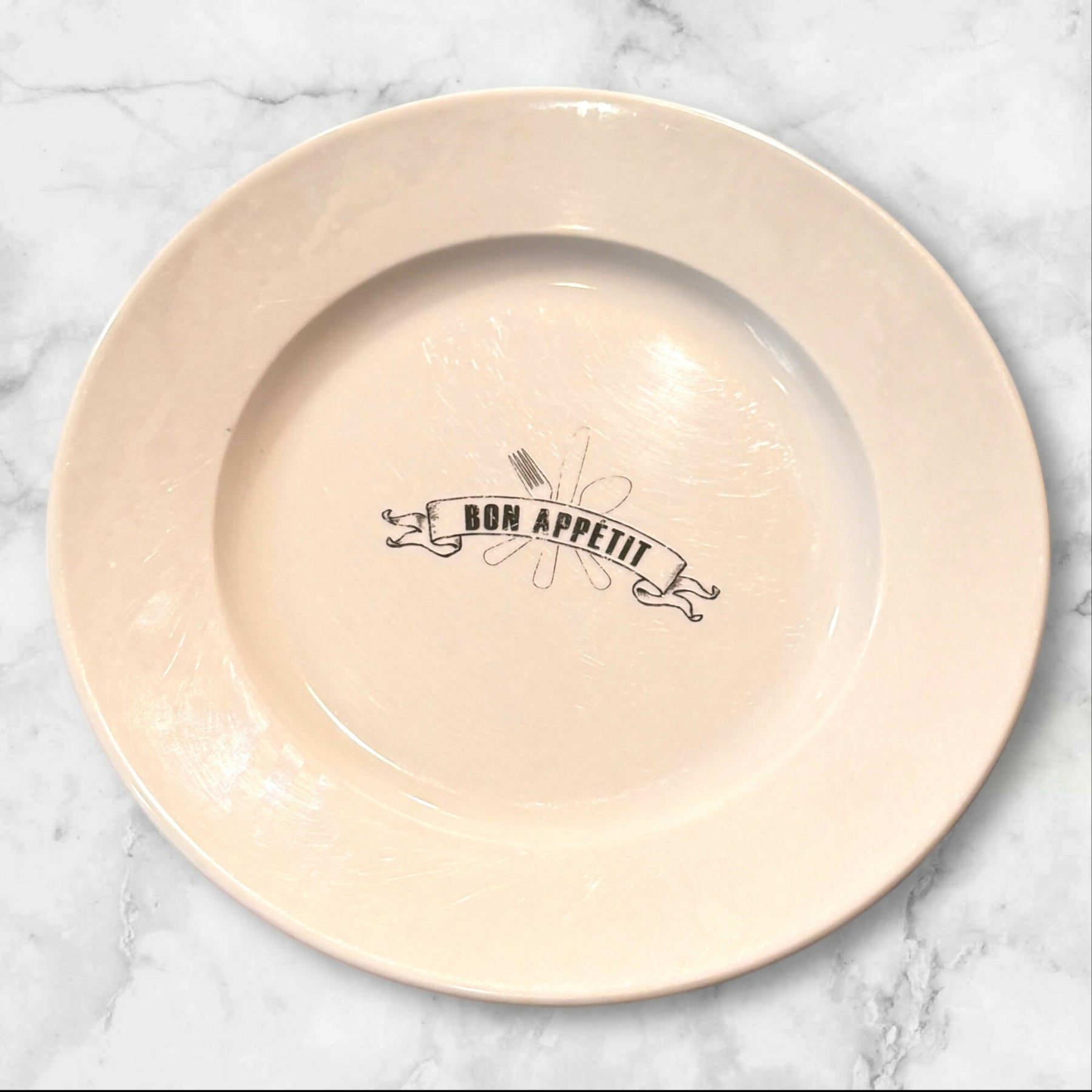 This set of Crate & Barrel Bon Appétit salad plates features the iconic black utensil-and-banner graphic, adding a playful, bistro-inspired touch to any table. Crafted from durable stoneware, these plates are ideal for snacks, appetizers, salads, or display. All four plates are in good used condition with some rim discoloration from prior use, but are fully functional. A discontinued and highly collectible Crate & Barrel pattern.
