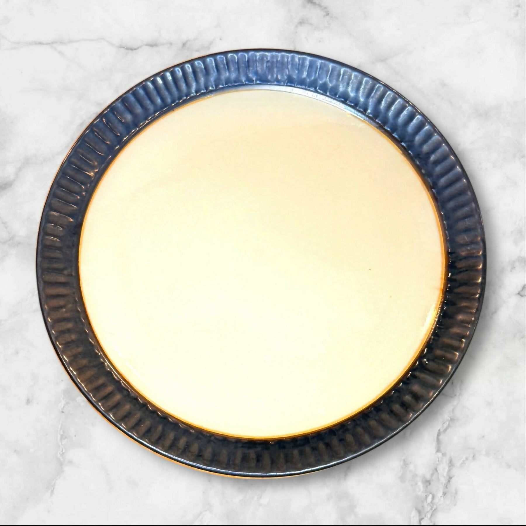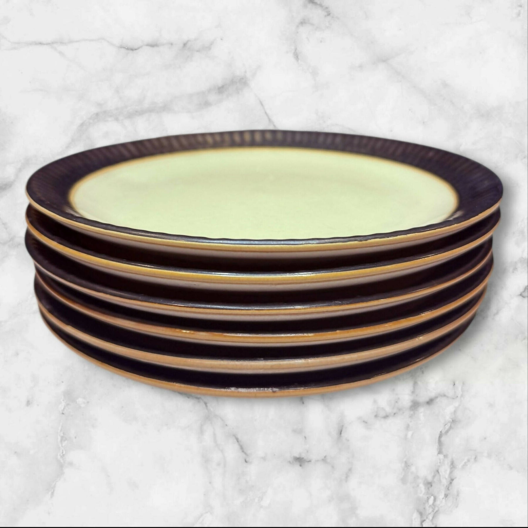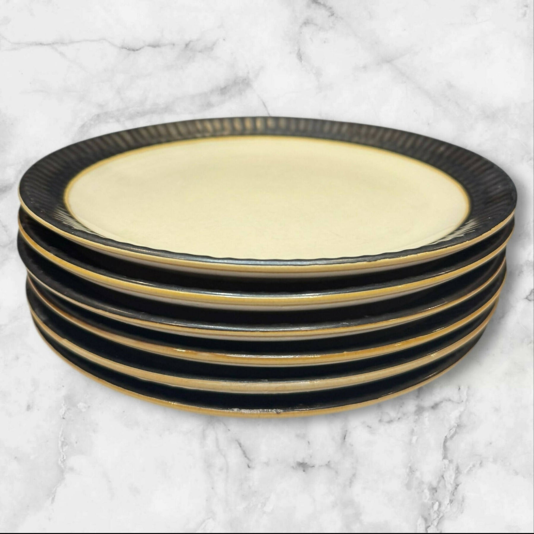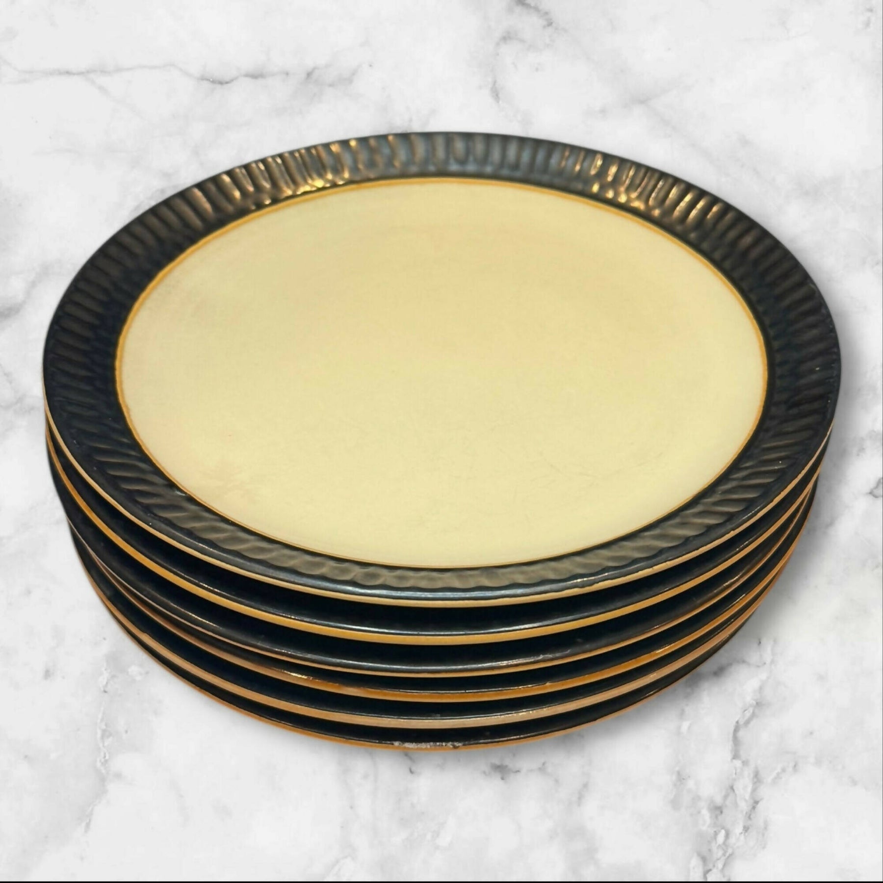 Bring artisanal charm to your table with this set of 6 Crate & Barrel Scavo salad plates. Measuring 8.5 inches, these plates feature a warm cream center paired with a textured, rustic rim. The discontinued Scavo collection blends handcrafted appeal with modern simplicity. All six plates are in excellent condition with minimal wear, perfect for salads, desserts, or everyday dining.