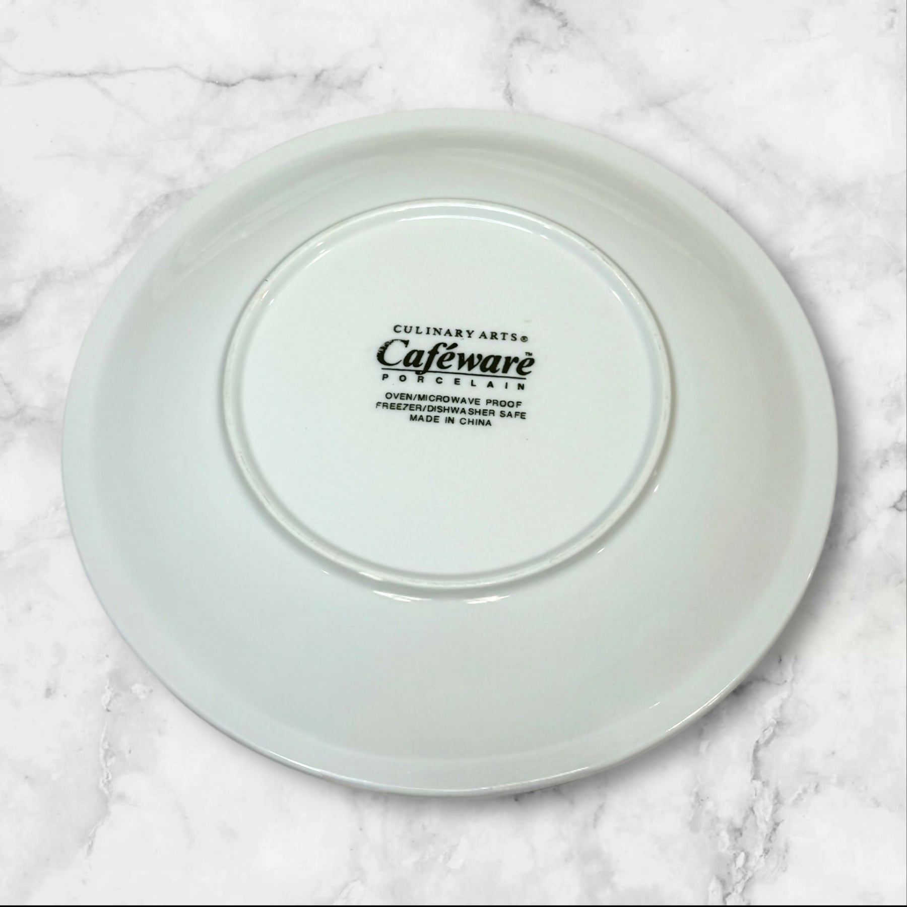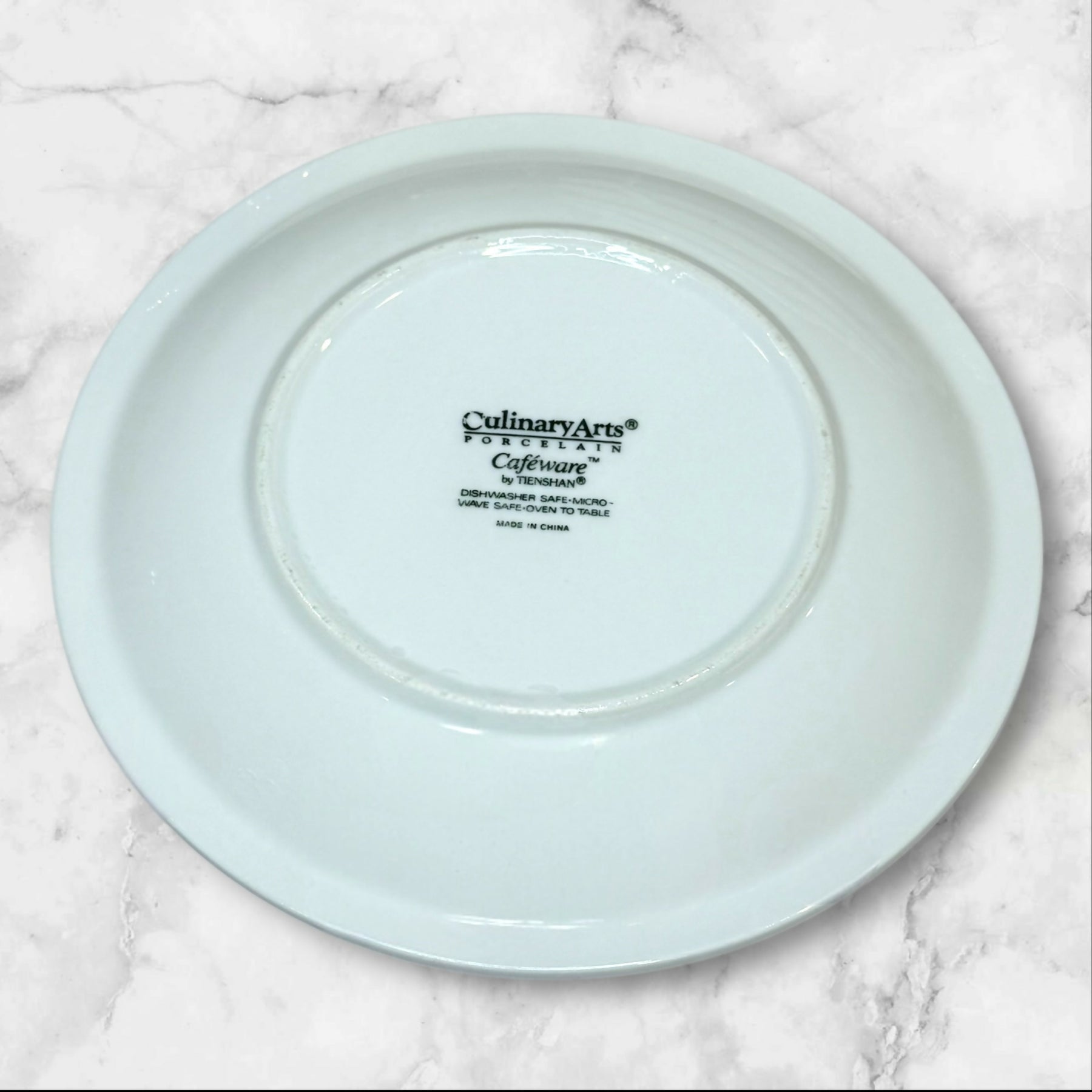 Upgrade your everyday dining with this set of 5 Caféware dinner plates from the Tienshan Culinary Arts line, sold exclusively through Crate & Barrel. Crafted from durable, restaurant-quality porcelain, these classic white plates offer clean lines, exceptional sturdiness, and timeless versatility. Light utensil marks from gentle use are present, with no chips or cracks. These discontinued pieces are increasingly hard to find and perfect for replacements or building your set.