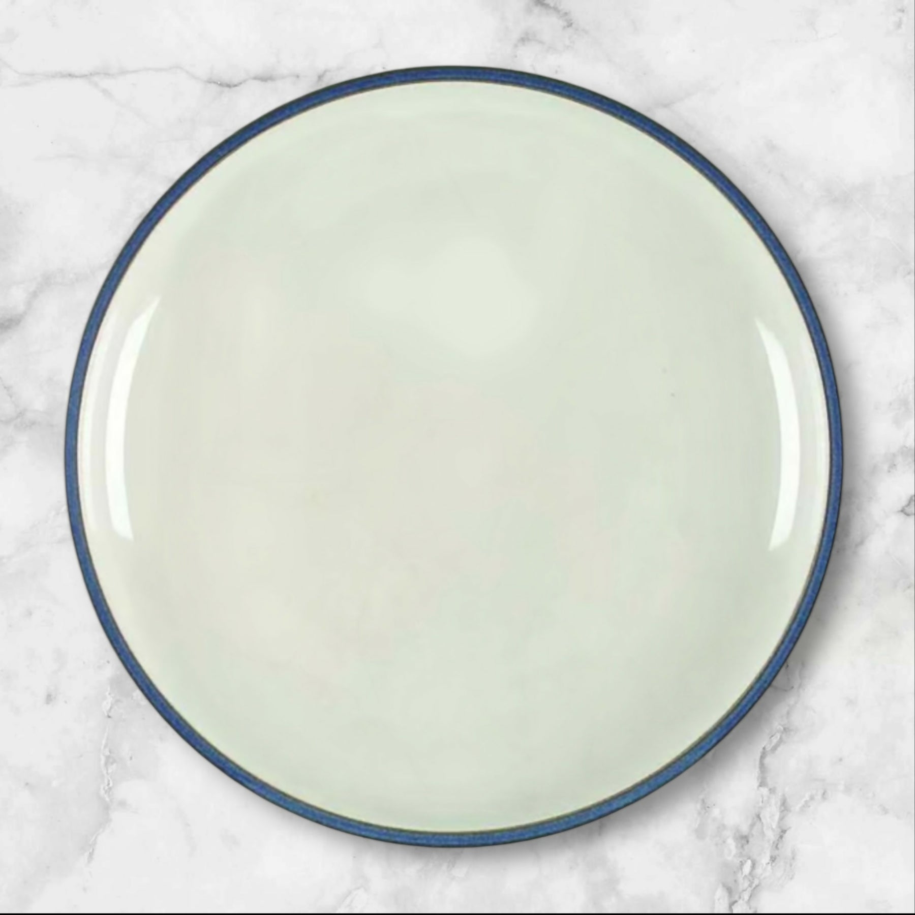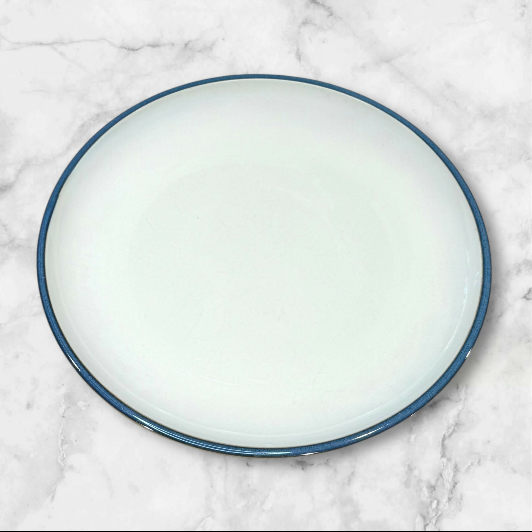Refresh your table with this set of 4 Dansk Plateau Blue dinner plates, featuring a clean cream center and soft blue rim. This discontinued pattern blends Scandinavian-inspired simplicity with everyday durability. Crafted in Thailand/China, these plates are microwave- and dishwasher-safe. All pieces show minor utensil marks from gentle use but have no chips, maintaining strong visual appeal and excellent everyday performance.
