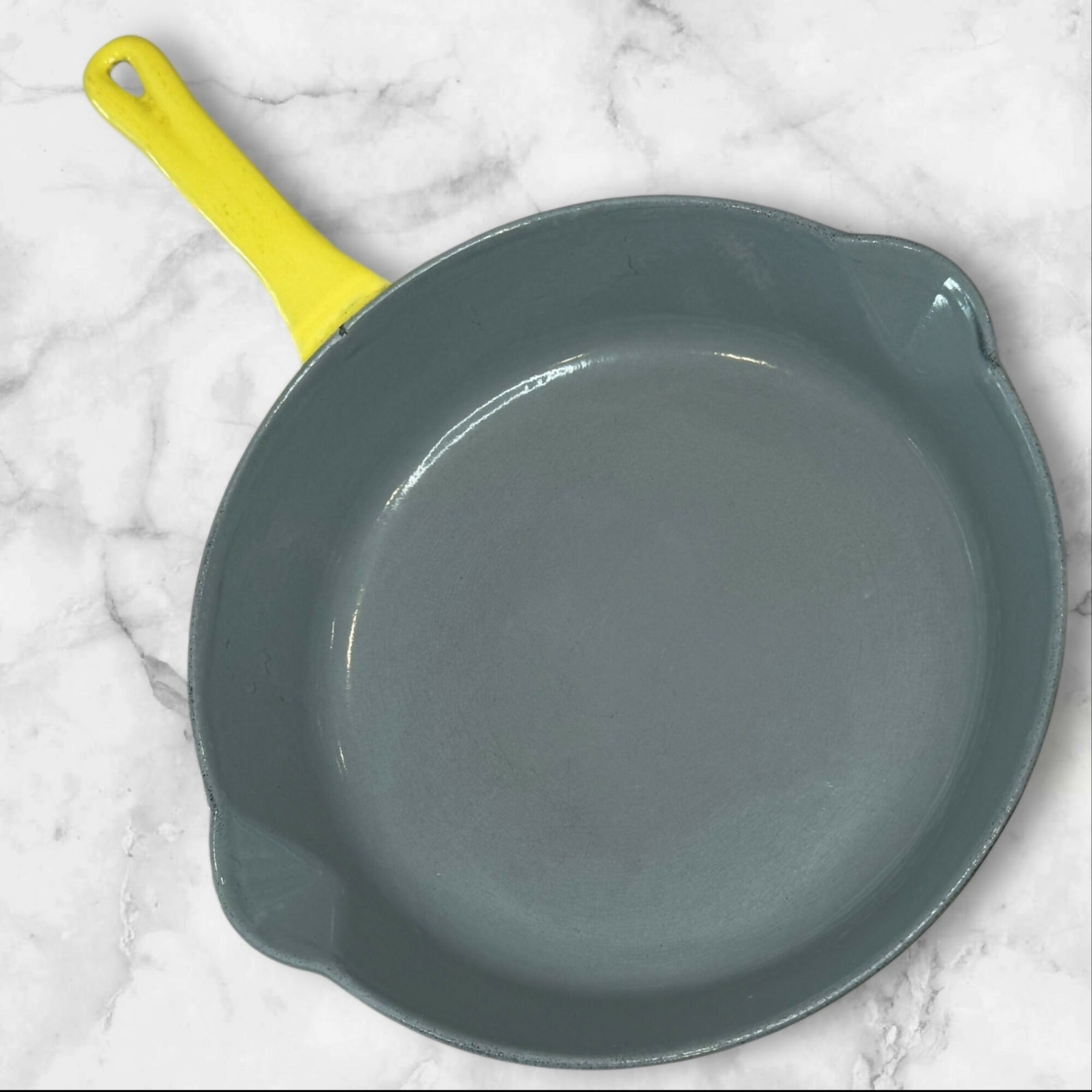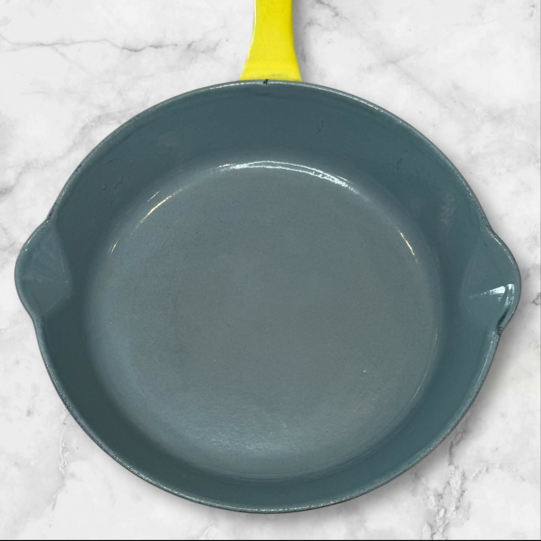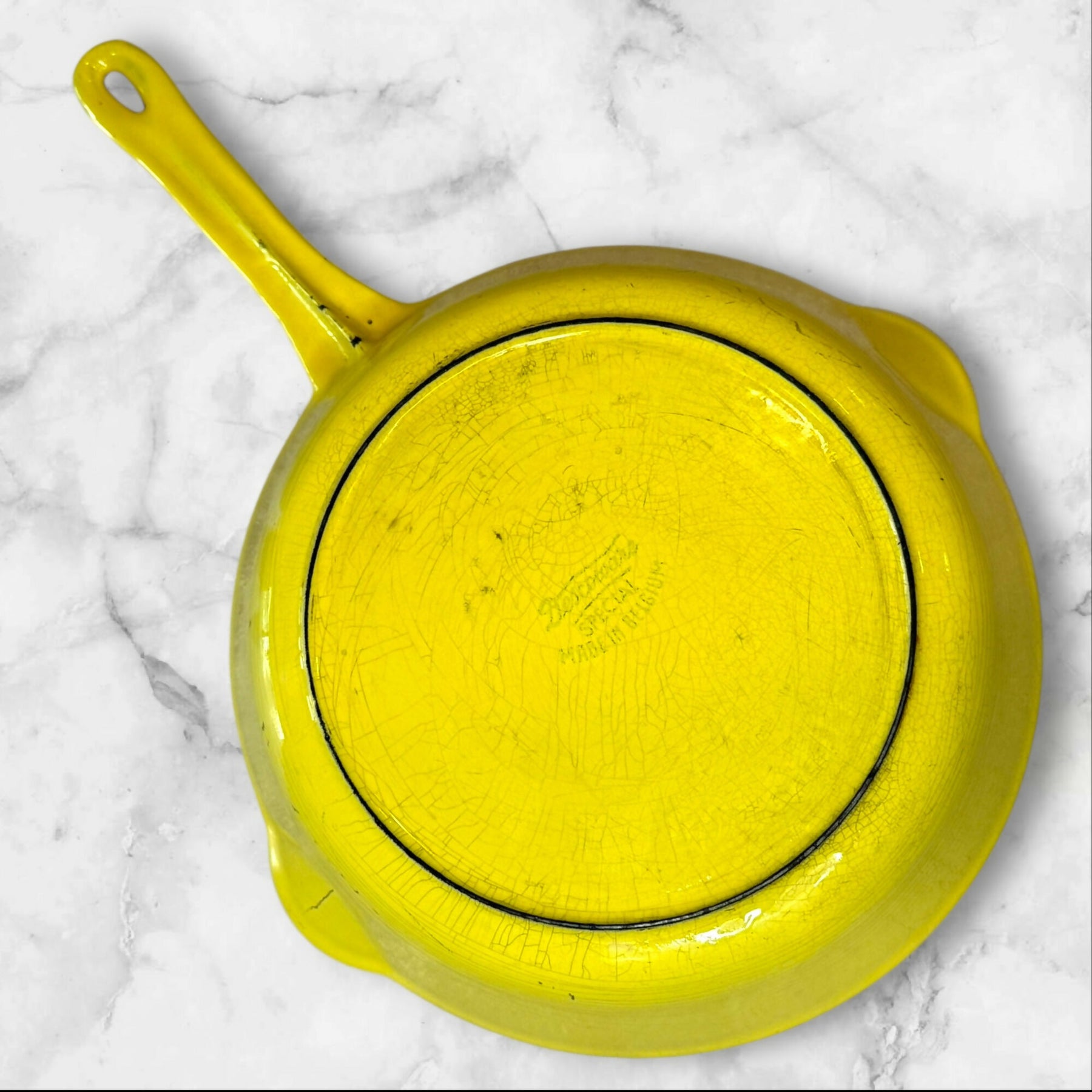 This vintage Descoware Special Yellow 9-inch skillet is a collectible Belgian-made classic, prized for its lightweight cast iron body and durable enamel finish. Ideal for frying, sautéing, and oven use, it features the iconic sunny yellow exterior and smooth gray interior. Visible wear and age-related crazing are normal for authentic Descoware and do not affect performance. A desirable addition for collectors and everyday cooks alike.