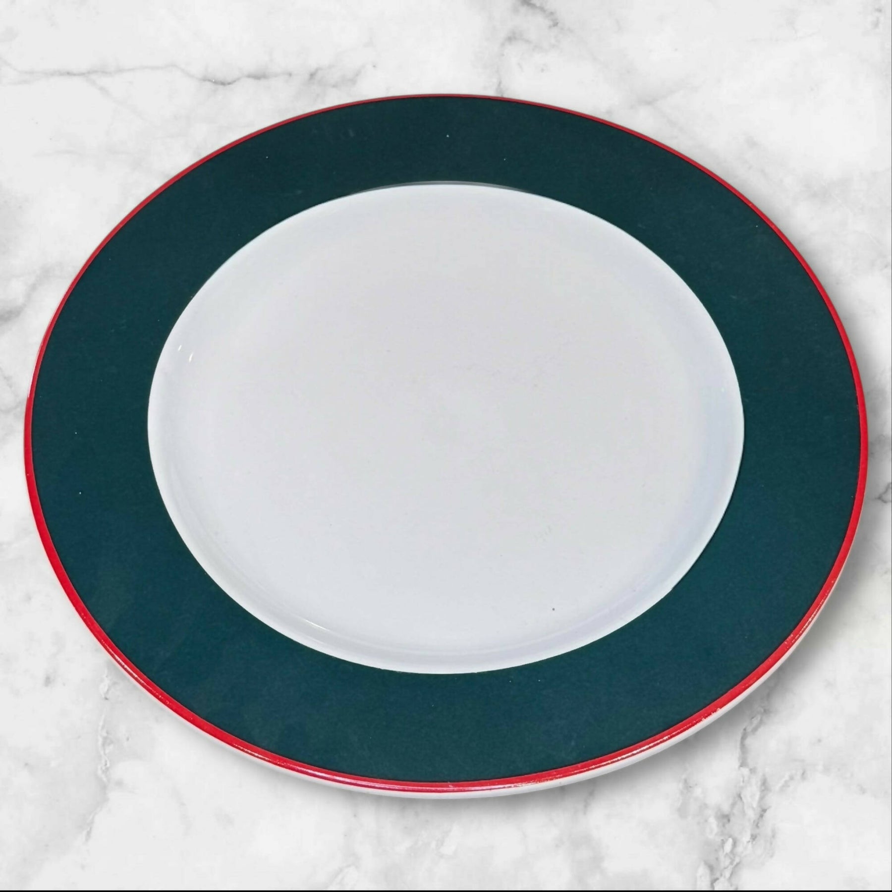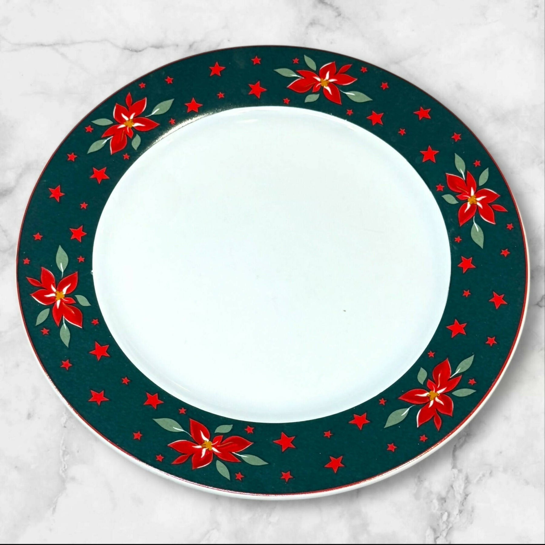 Celebrate the holidays with this festive set of Furio Contemporary Casuals dinner plates. Featuring bold poinsettia artwork and rich green borders, these plates bring cheerful charm to any Christmas table setting. Crafted from durable ceramic, they’re ideal for seasonal entertaining, family gatherings, or display. Each plate is in great condition, offering vibrant color and timeless holiday style perfect for collectors or everyday seasonal use.