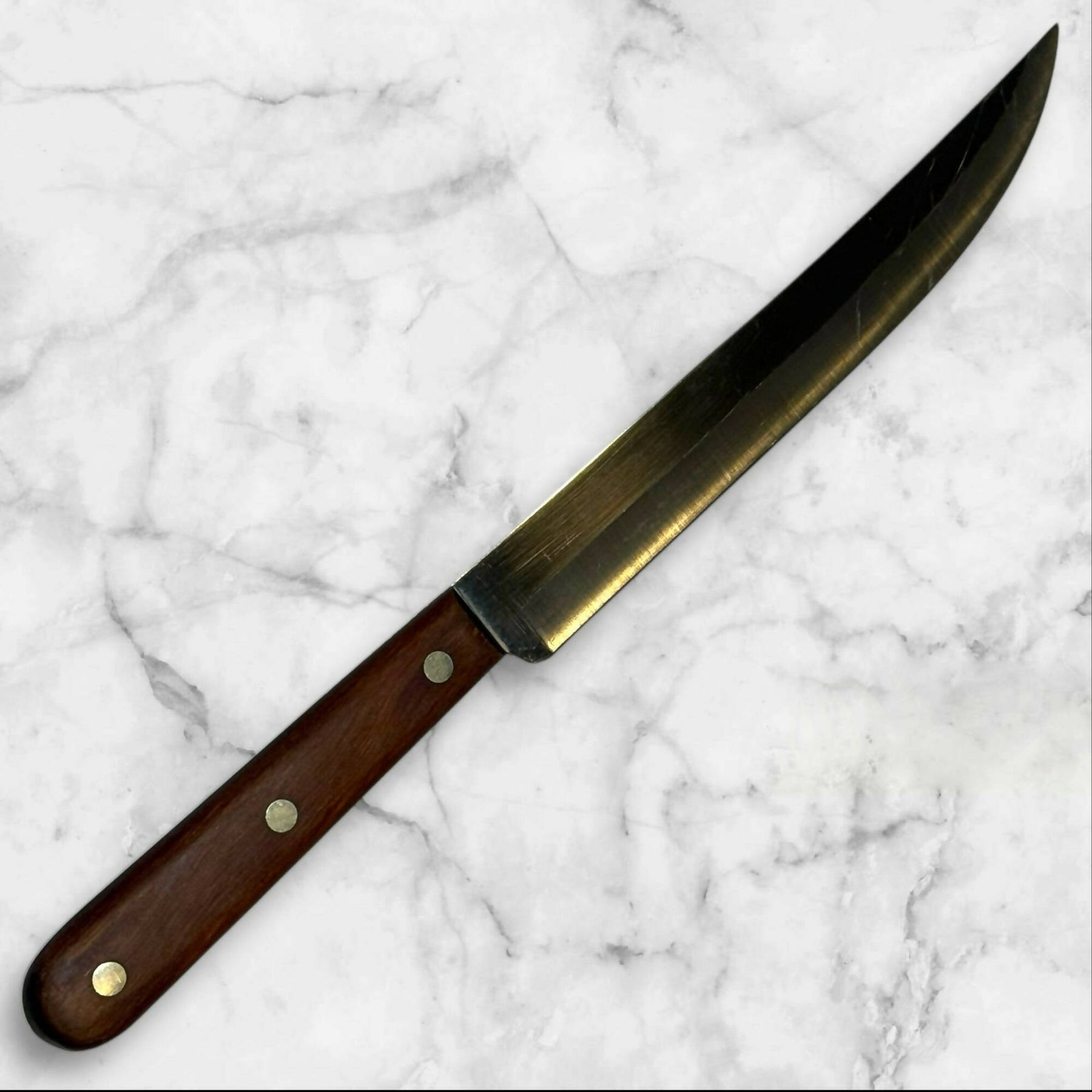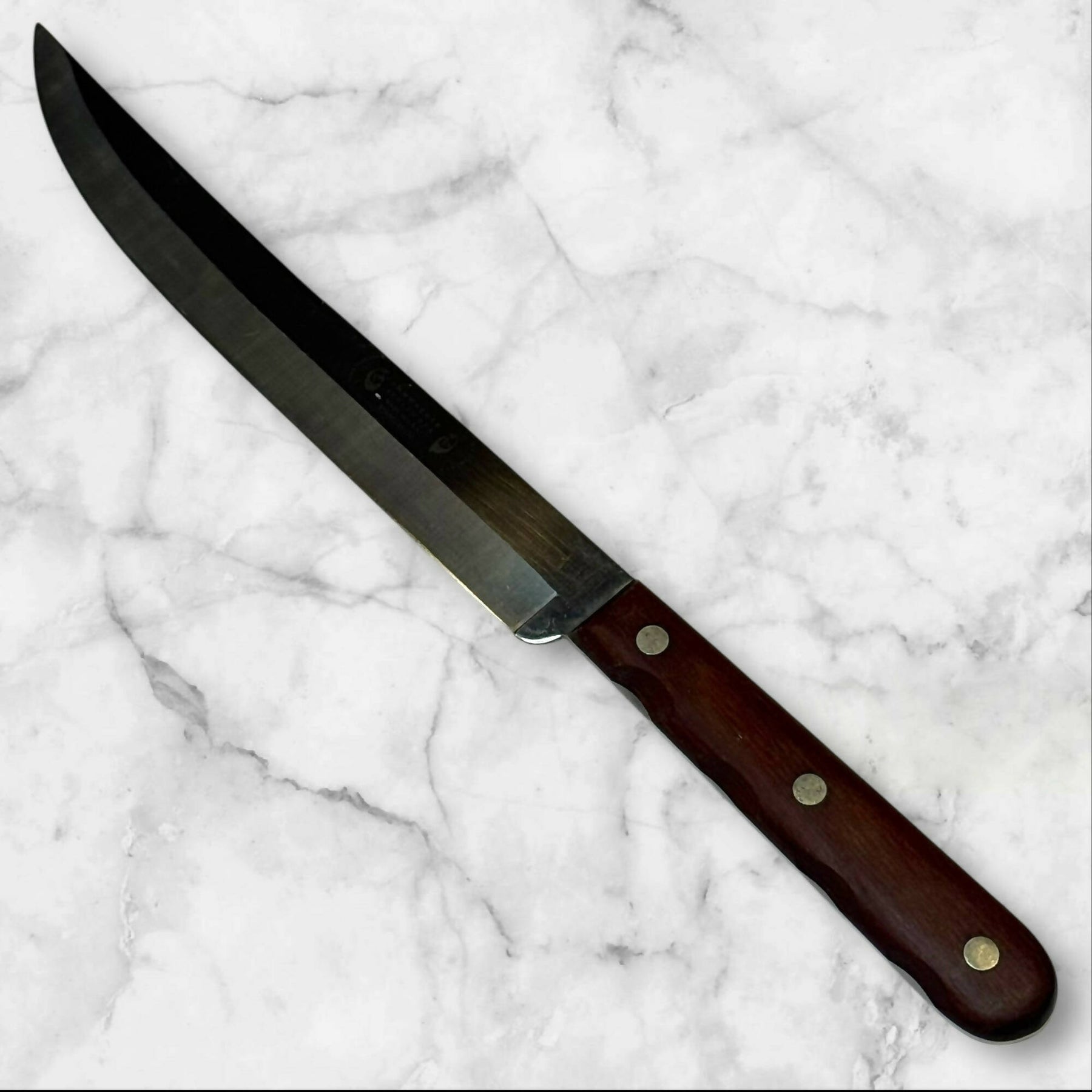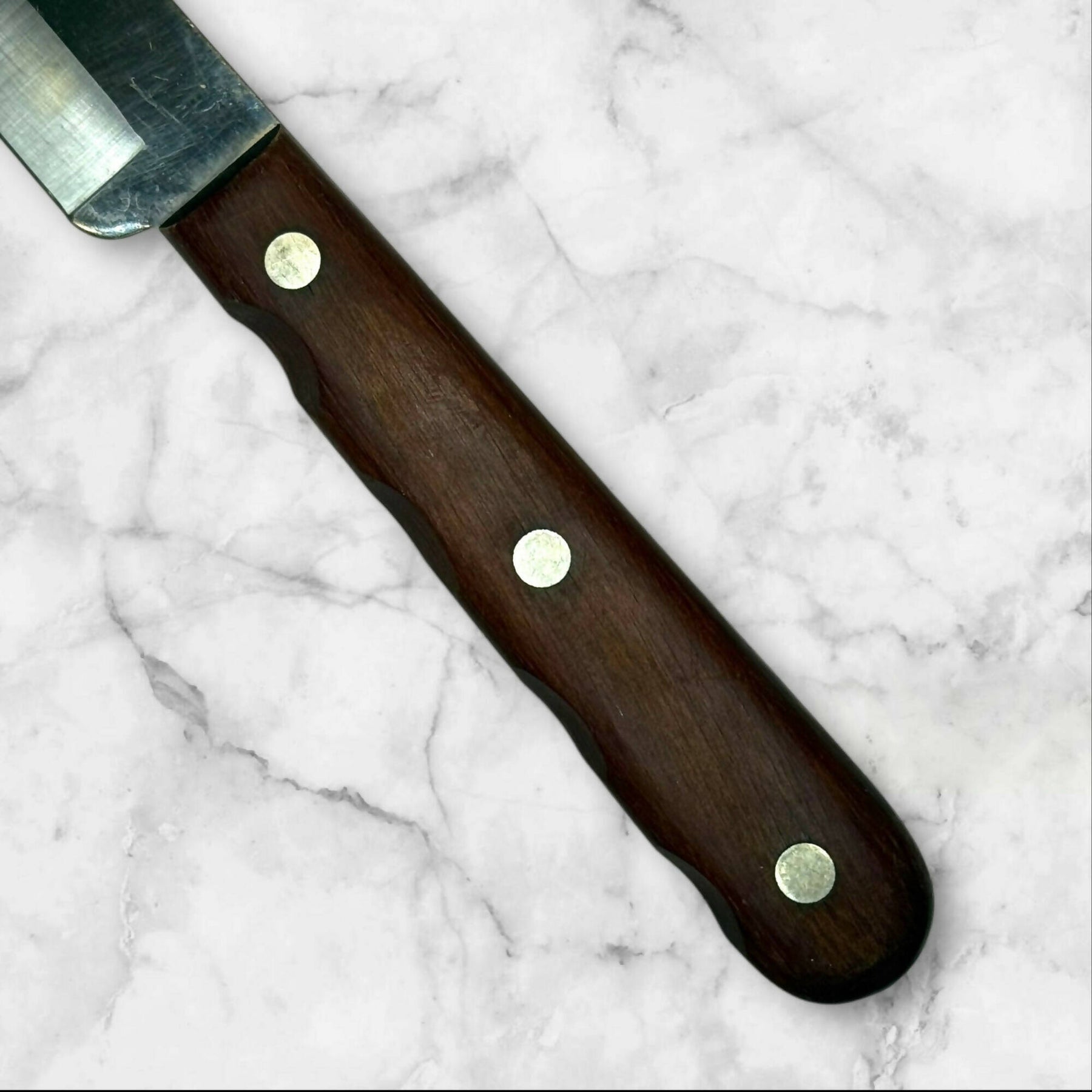 This vintage Hammacher Schlemmer carving knife is crafted in the USA with high-quality stainless steel and a contoured triple-riveted hardwood handle. Known for durability and precision, this knife delivers smooth slicing for meats, roasts, and everyday prep. A collectible piece of American-made cutlery, it provides exceptional balance and performance. Ideal for home cooks, chefs, and vintage kitchenware collectors seeking quality craftsmanship.
