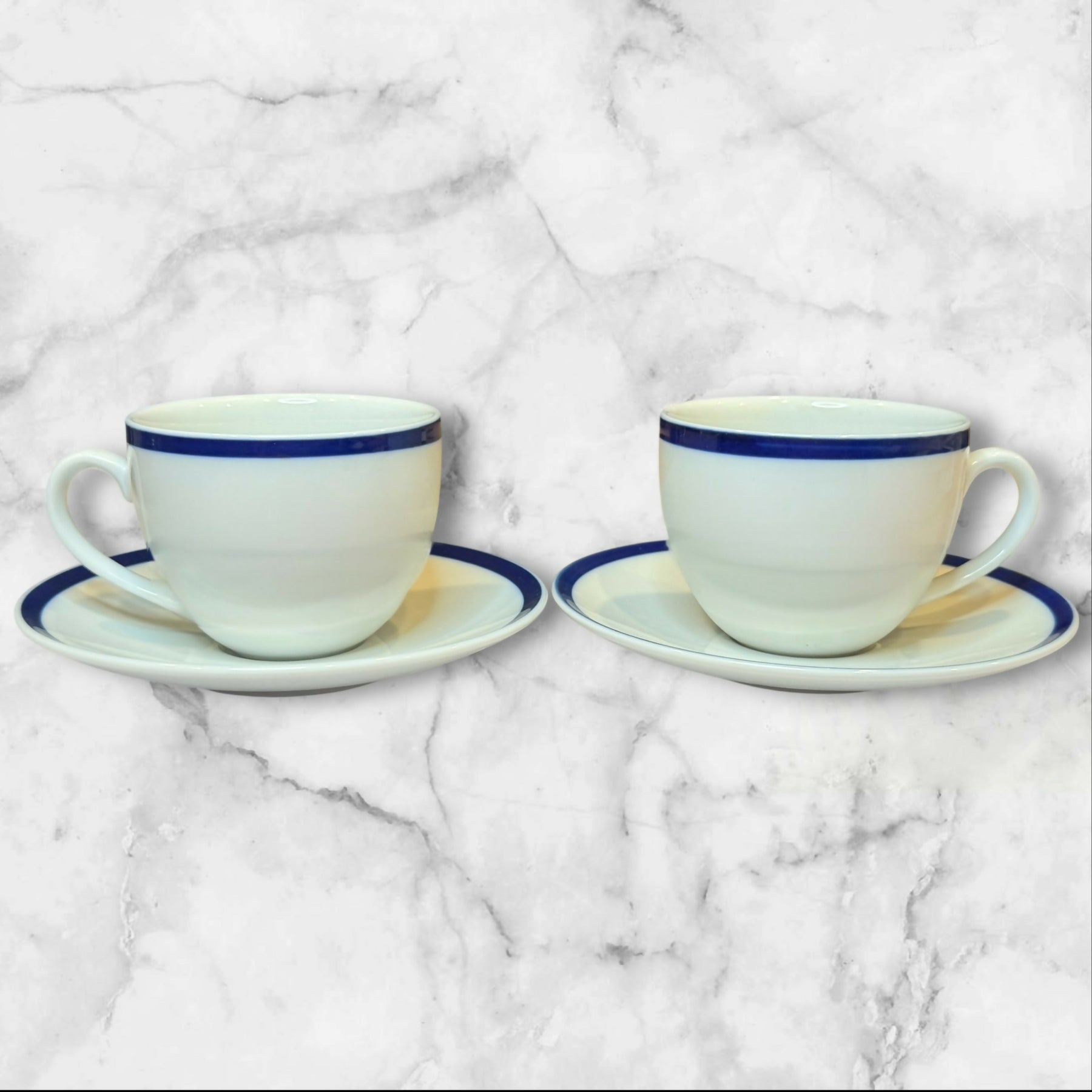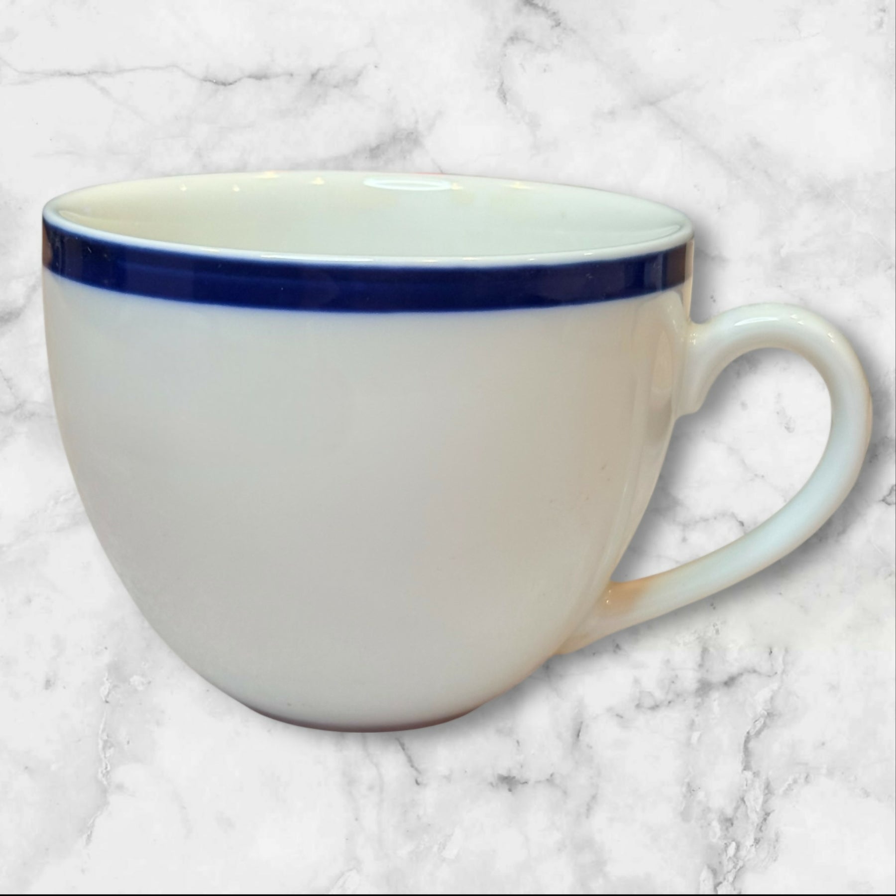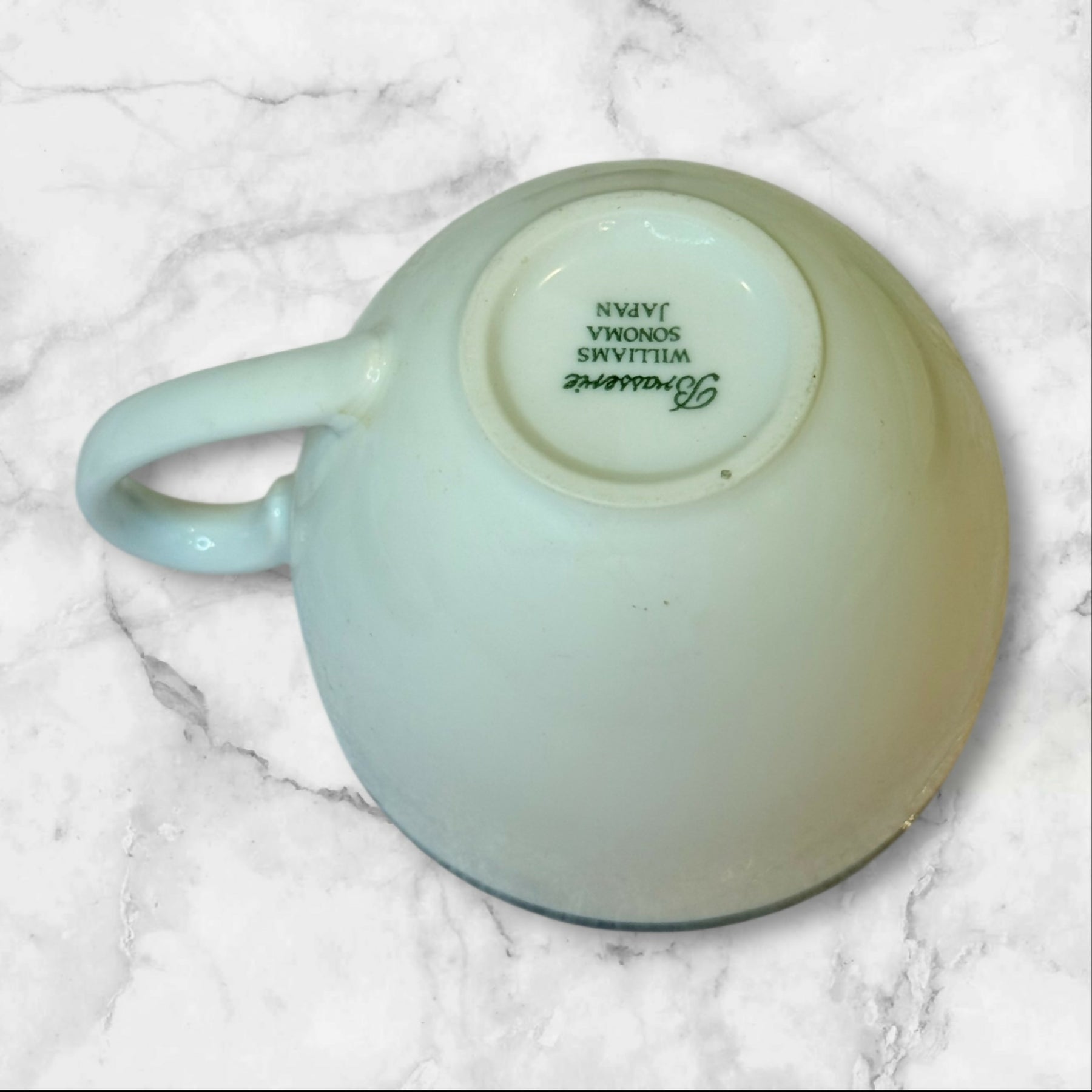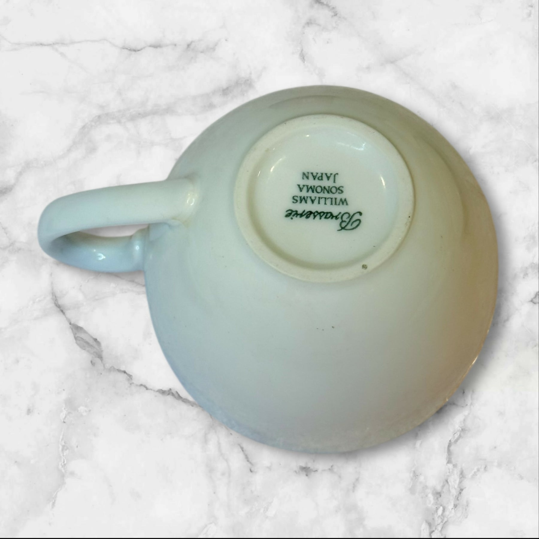 Complete your collection or enjoy timeless Williams Sonoma quality with this single Brasserie Blue cup and saucer set. Crafted in Japan, each piece is made from durable porcelain and finished with the signature cobalt blue rim. The saucer measures 6.5” in diameter, and the cup measures 3.75” wide by 3” high. A discontinued and collectible design, perfect as a replacement piece or for everyday coffee and tea service.